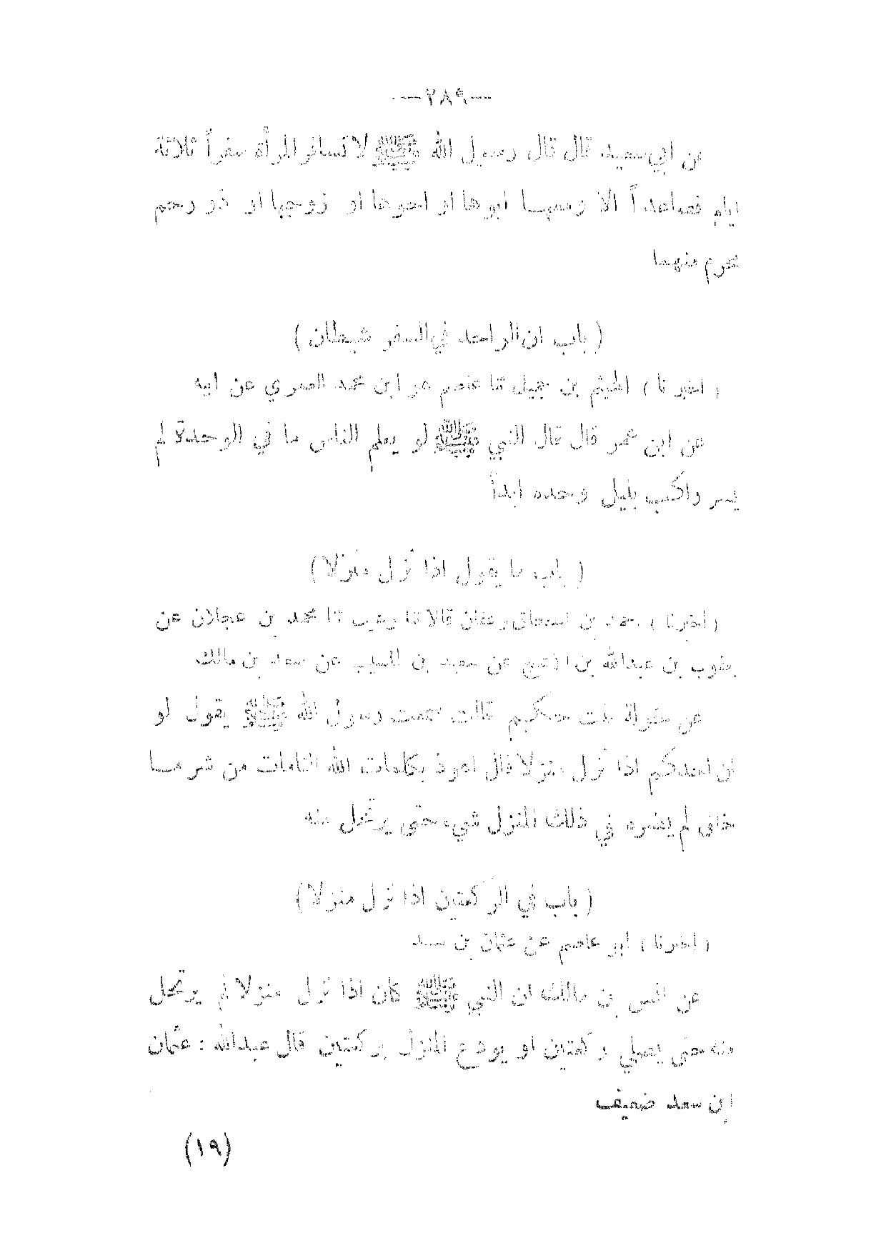 (أخبرنا) أبو عاصم عن عثمان بن سعد عن انس بن مالك ان النبي صلى الله عليه وآله كان إذا نزل منزلا لم يرتحل منه حتى يصلي ركعتين أو يودع المنزل بركعتين قال عبد الله : عثمان ابن سعد ضعيف