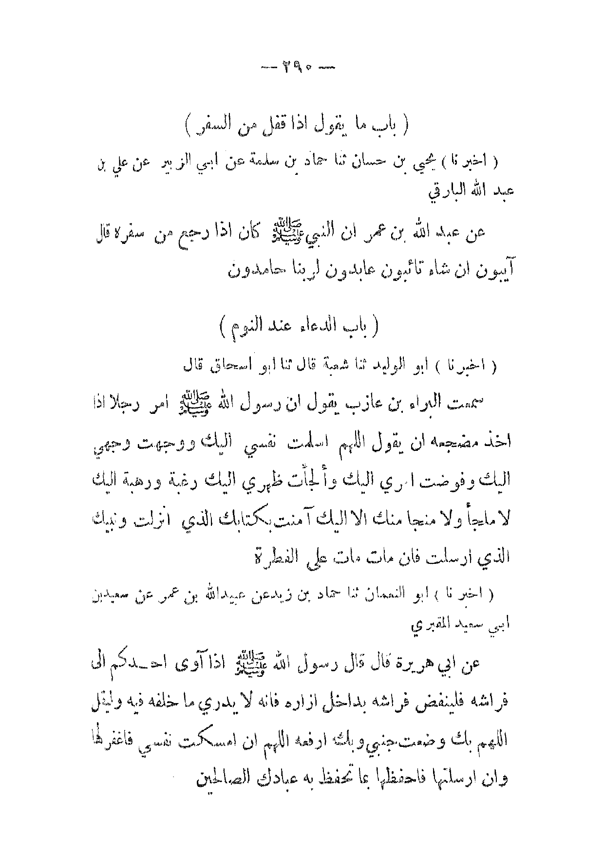 (أخبرنا) يحيى بن حسان ثنا حماد بن سلمة عن ابي الزبير عن علي بن عبد الله البارقي عن عبد الله بن عمر ان النبي صلى الله عليه وآله كان إذا رجع من سفره قال آيبون ان شاء تائبون عابدون لربنا حامدون