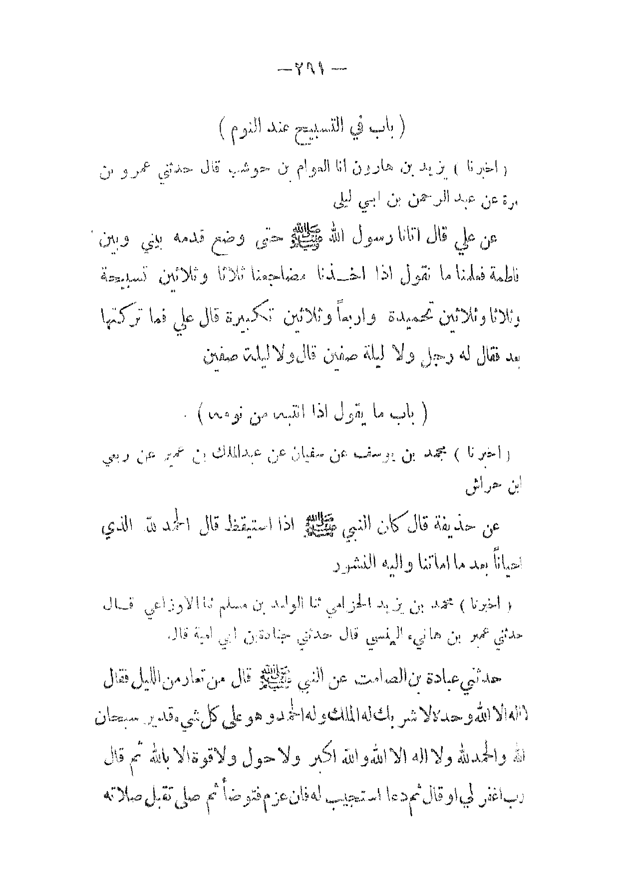 (أخبرنا) محمد بن يوسف عن سفيان عن عبد الملك بن عمير عن ربعي ابن حراش عن حذيفة قال كان النبي صلى الله عليه وسلم إذا استيقظ قال الحمد لله الذي احيانا بعد ما اماتنا واليه النشور