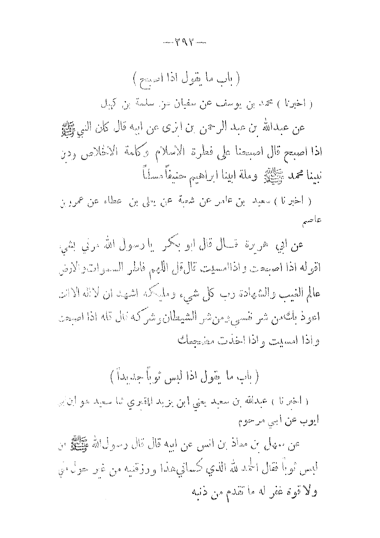 (أخبرنا) محمد بن يوسف عن سفيان عن سلمة بن كهيل عن عبد الله بن عبد الرحمن بن ابزى عن ابيه قال كان النبي صلى الله عليه وسلم إذا اصبح قال اصبحنا على فطرة الاسلام وكلمة الاخلاص ودين نبينا محمد صلى الله عليه وسلم وملة ابينا ابراهيم حنيفا مسلما