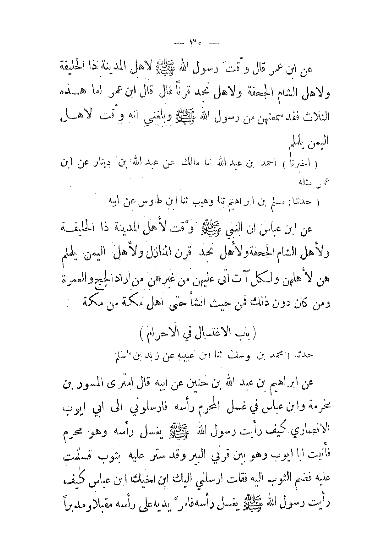 [ 30 ] عن ابن عمر قال وقت رسول الله صلى الله عليه وسلم لاهل المدينة ذا الحليفة ولاهل الشام الجحفة ولاهل نجد قرنا قال قال ابن عمر اما هذه الثلاث فقد سمعتهن من رسول الله صلى الله عليه وسلم وبلغني انه وقت لاهل اليمن يلملم