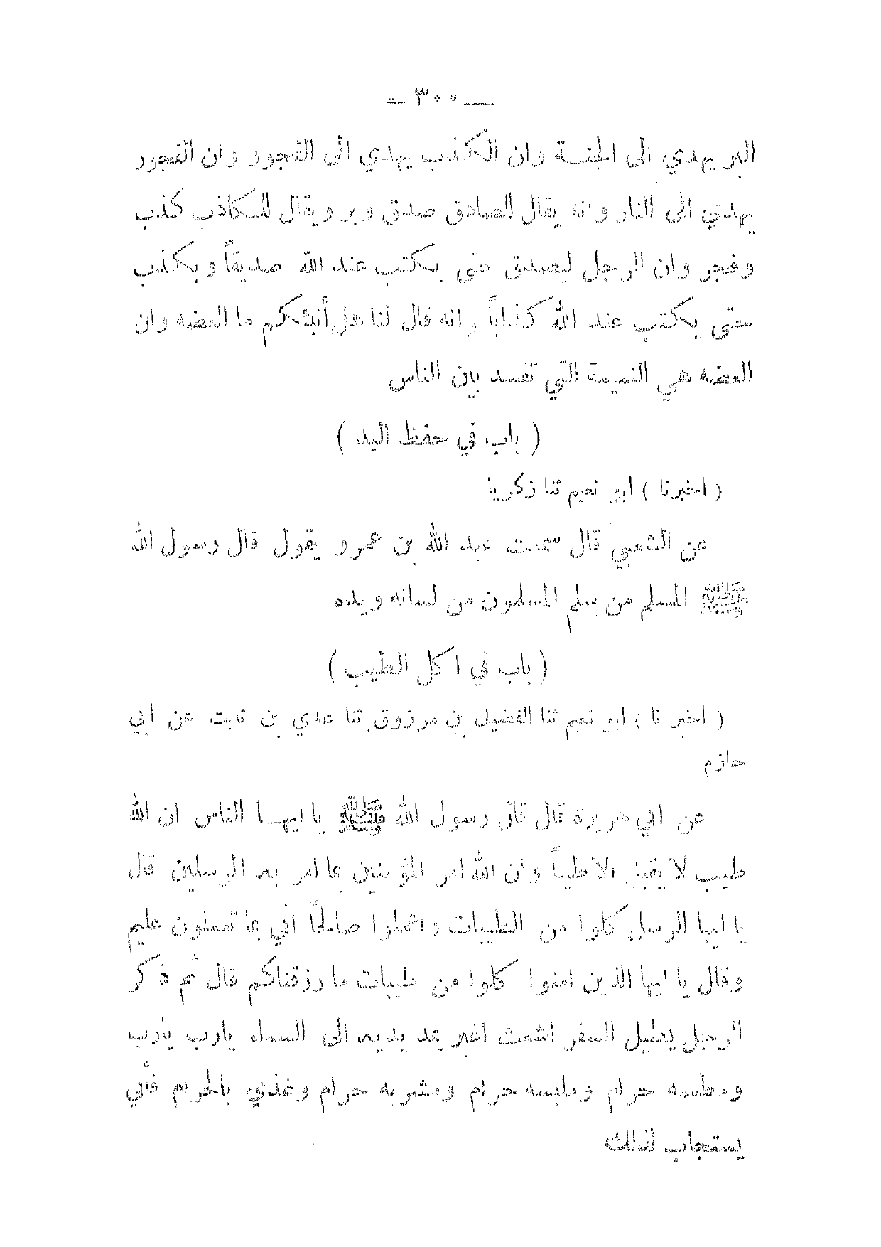 (أخبرنا) أبو نعيم ثنا الفضيل بن مرزوق ثنا عدي بن ثابت عن ابي حازم عن ابي هريرة قال قال رسول الله صلى الله عليه وسلم يا ايها الناس ان الله طيب لا قبل الا طيبا وان الله امر المؤمنين بما امر به المرسلين قال يا ايها الرسل كلوا من الطيبات واعملوا صالحا اني بما تعملون عليم وقال يا ايها الذين امنوا كلوا من طيبات ما رزقناكم قال ثم ذكر الرجل يطيل السفر اشعث اغبر يمد يديه إلى السماء يا رب يا رب ومطعمه حرام وملبسه حرام ومشربه حرام وغذي بالحرام فأني يستجاب لذلك