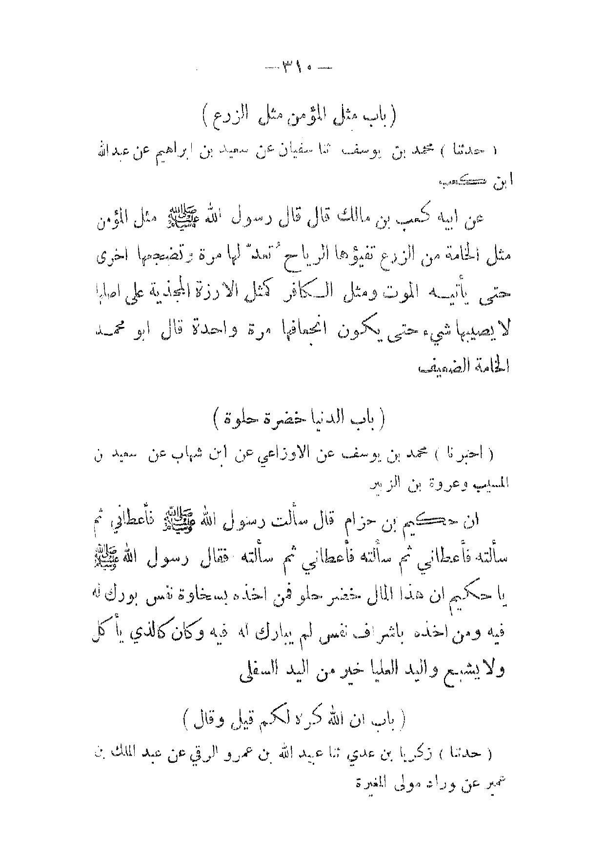 (أخبرنا) محمد بن يوسف عن الاوزاعي عن ابن شهاب عن سعيد بن المسيب وعروة بن الزبير ان حكيم بن حزام قال سألت رسول الله صلى الله عليه وسلم فأعطاني ثم سألته فأعطاني ثم سألته فأعطاني ثم سألته فقال رسول الله صلى الله عليه وسلم يا حكيم ان هذا المال خضر حلو فمن اخذه بسخاوة نفس بورك له فيه ومن اخذه باشراف نفس لم يبارك له فيه وكان كالذي يأكل ولا يشبع واليد العليا خير من اليد السفلى