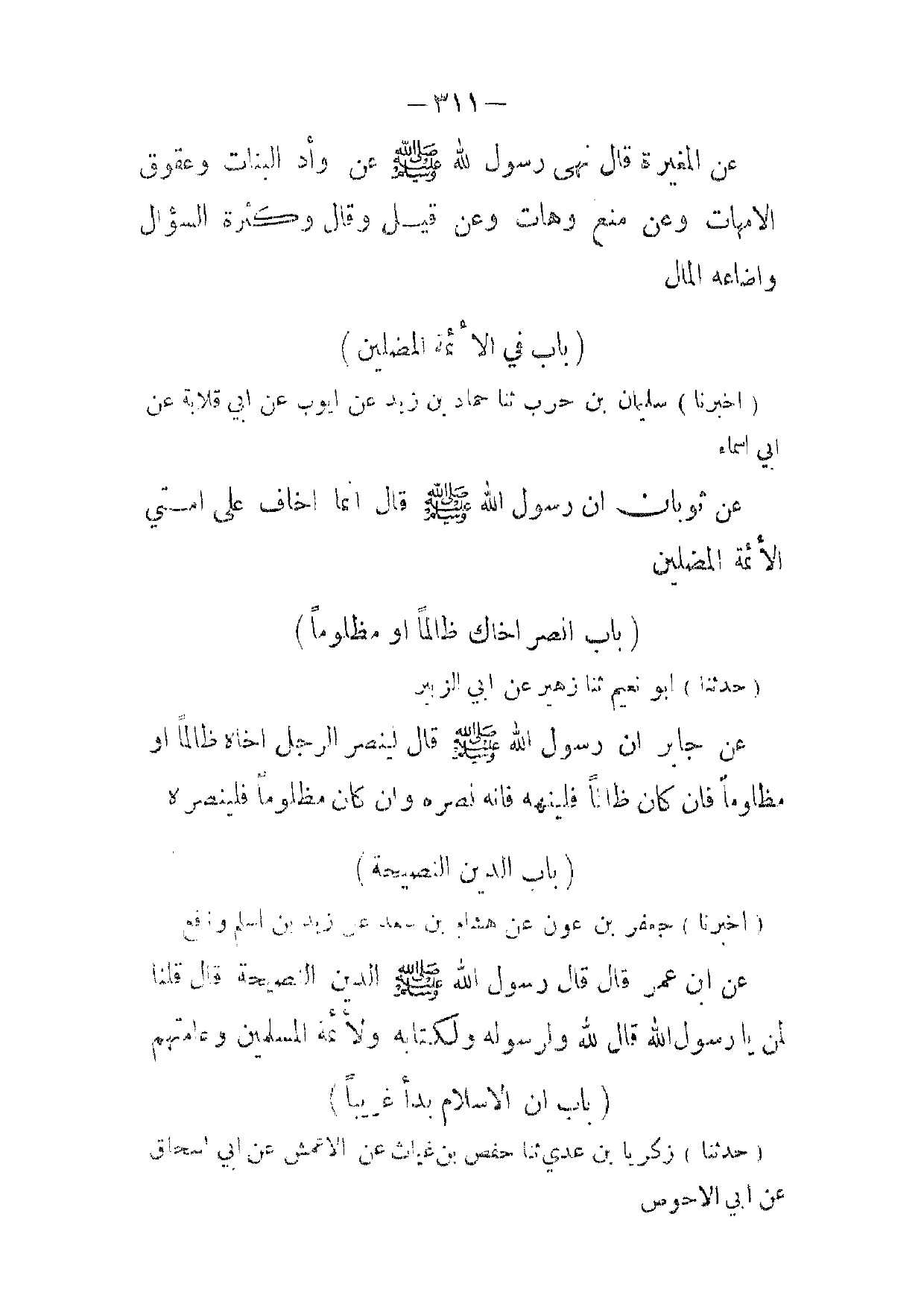 [ 311 ] عن المغيرة قال نهى رسول الله صلى الله عليه وسلم عن وأد البنات وعقوق الامهات وعن منع وهات وعن قيل وقال وكثرة السؤال واضاعه المال