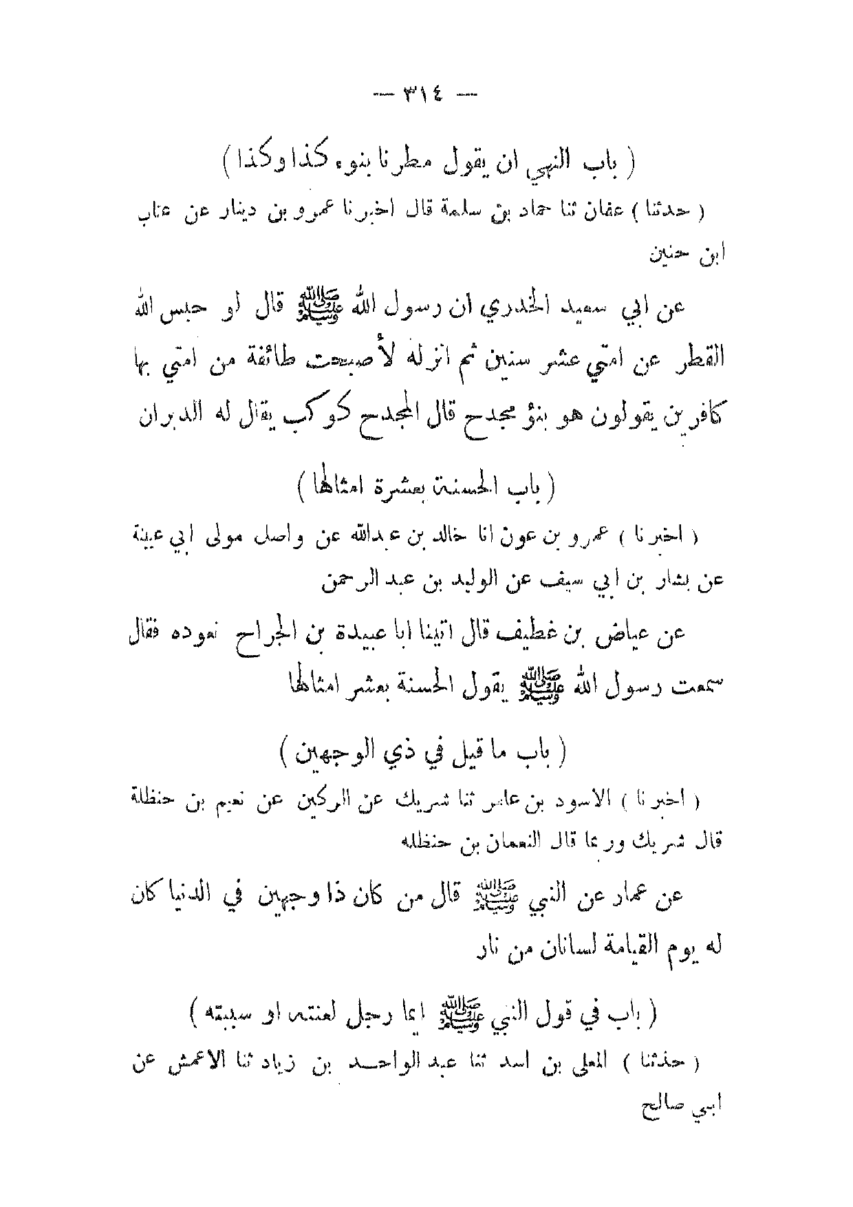 (حدثنا) عفان ثنا حماد بن سلمة قال اخبرنا عمرو بن دينار عن عتاب ابن حنين عن ابي سعيد الخدري ان رسول الله صلى الله عليه وسلم قال لو حبس الله القطر عن امتي عشر سنين ثم انزله لاصبحت طائفة من امتي بها كافرين يقولون هو بنؤ مجدح قال المجدح كوكب يقال له الدبر ان