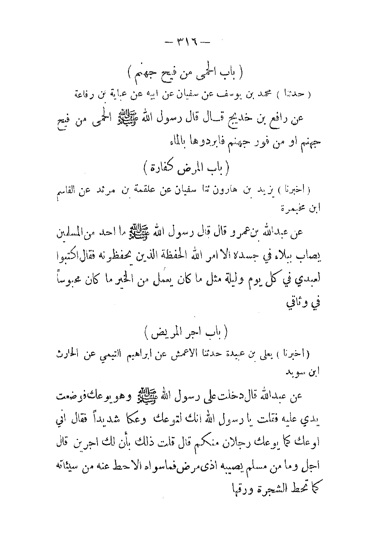 (حدثنا) محمد بن يوسف عن سفيان عن ابيه عن عباية بن رفاعة عن رافع بن خديج قال قال رسول الله صلى الله عليه وسلم الحمى من فيح جهنم أو من فور جهنم فابردوها بالماء