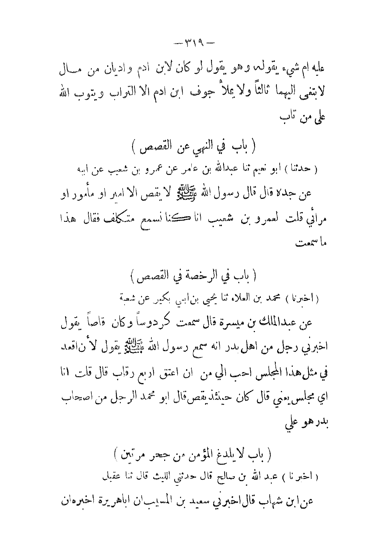 [ 319 ] عليه ام شئ يقوله وهو يقول لو كان لابن ادم واديان من مال لا بتغى اليهما ثالثا ولا يملا جوف ابن ادم الا التراب ويتوب الله على من تاب