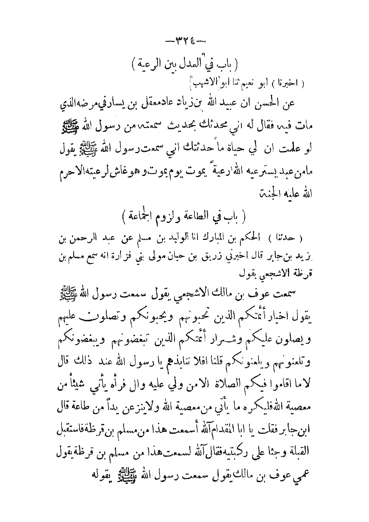 (أخبرنا) أبو نعيم ثنا أبو الاشهب عن الحسن ان عبيدالله بن زياد عاد معقل بن يسار في مرضه الذي مات فيه فقال له اني محدثك بحديث سمعته من رسول الله صلى الله عليه وسلم لو علمت ان لي حياة ما حدثتك اني سمعت رسول الله صلى الله عليه وسلم يقول ما من عبد يسترعيه الله رعية يموت يوم يموت وهو غاش لرعيته الاحرم الله عليه الجنة