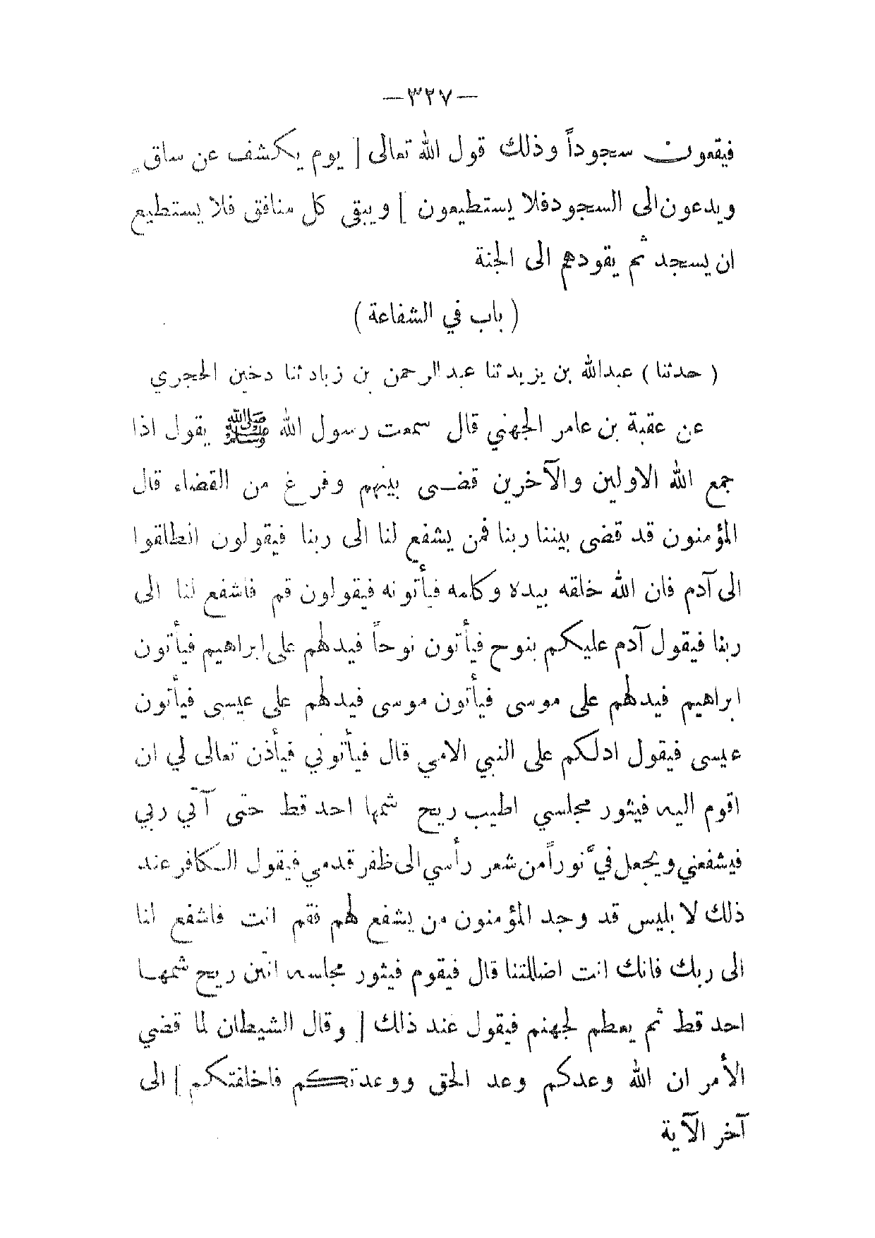 [ 327 ] فيقعون سجودا وذلك قول الله تعالى [ يوم يكشف عن ساق ويدعون إلى السجود فلا يستطيعون ] ويبقى كل منافق فلا يستطيع ان يسجد ثم يقودهم إلى الجنة