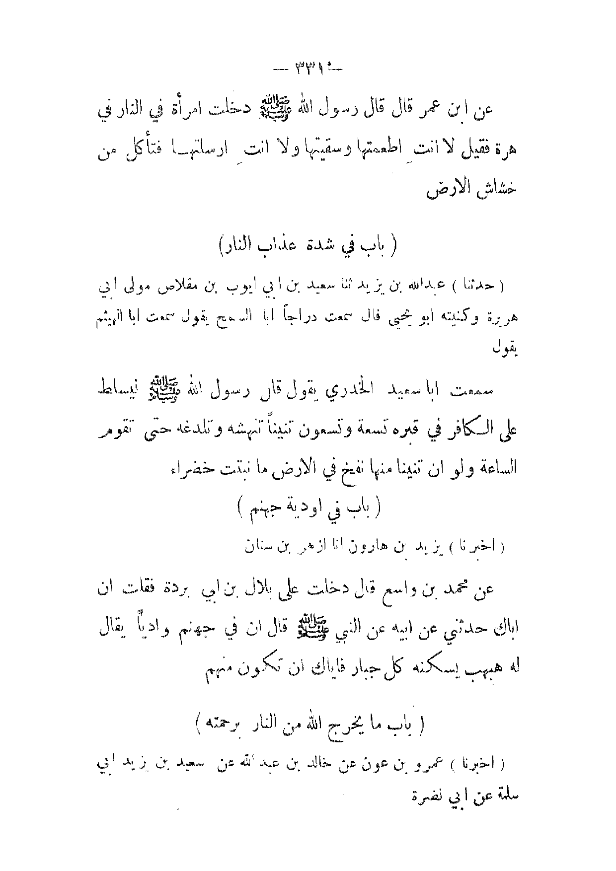 (أخبرنا) يزيد بن هارون انا ازهر بن سنان عن محمد بن واسع قال دخلت على بلال بن ابي بردة فقلت ان اباك حدثني عن ابيه عن النبي صلى الله عليه وسلم قال ان في جهنم واديا يقال له هبهب يسكنه كل جبار فاياك ان تكون منهم