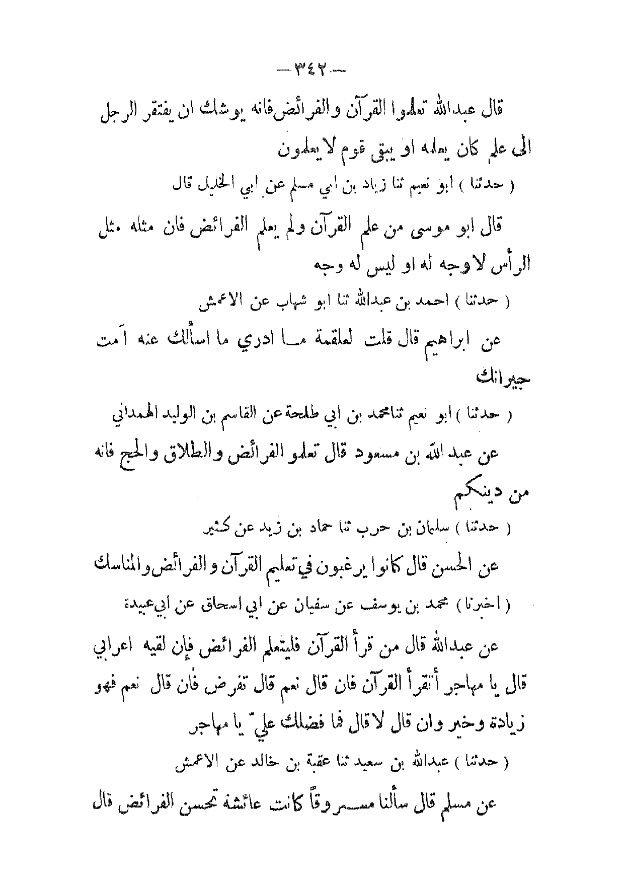[ 342 ] قال عبد الله تعلموا القرآن والفرائض فانه يوشك ان يفتقر الرجل إلى علم كان يعلمه أو يبقى قوم لا يعلمون
