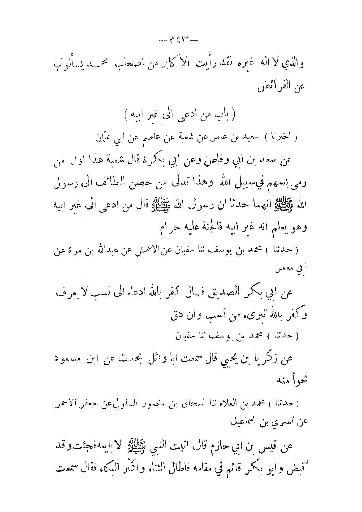 (حدثنا) محمد بن يوسف ثنا سفيان عن الاعمش عن عبد الله بن مرة عن ابي معمر عن ابي بكر الصديق قال كفر بالله ادعاء إلى نسب لا يعرف وكفر بالله تبرئ من نسب وان دق