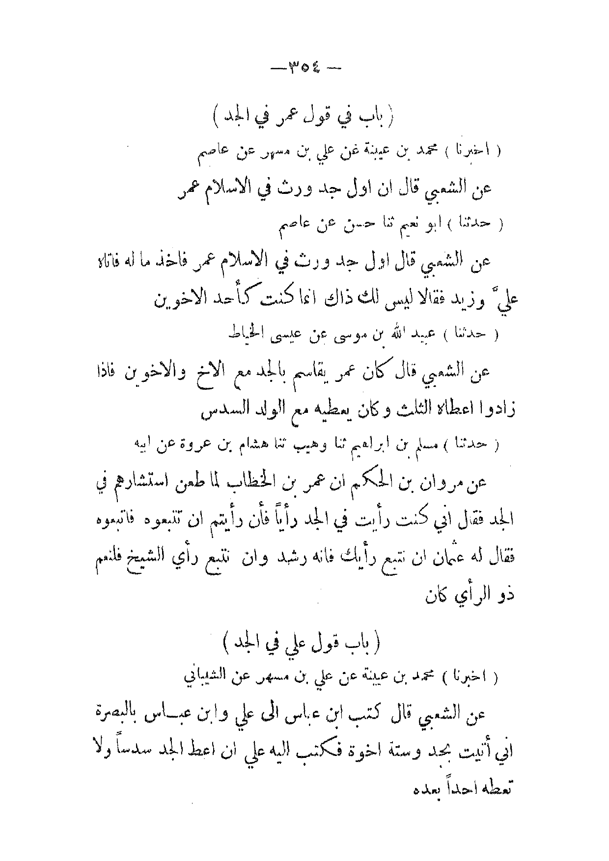 (أخبرنا) محمد بن عيينة عن علي بن مسهر عن عاصم عن الشعبي قال ان اول جد ورث في الاسلام عمر