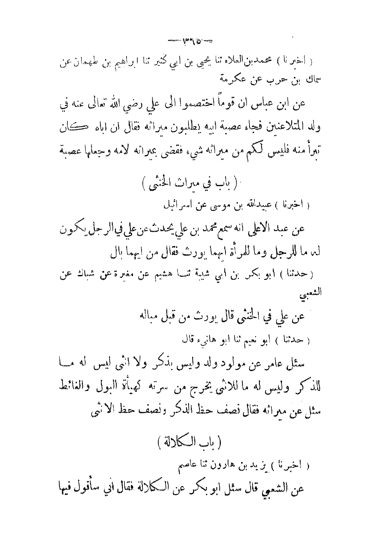 (حدثنا) أبو بكر بن ابي شيبة ثنا هشيم عن معيرة عن شباك عن الشعبي عن علي في الخنثى قال يورث من قبل مباله