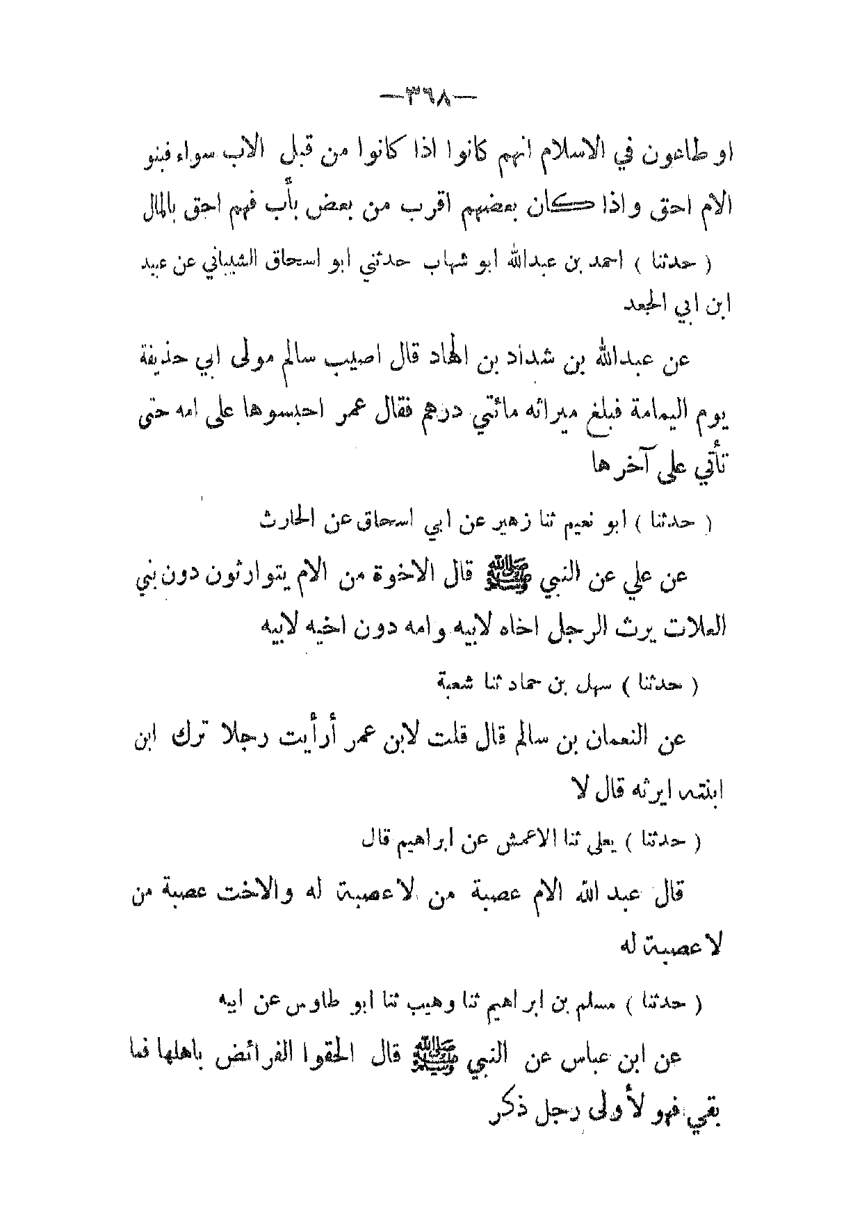 (حدثنا) مسلم بن ابراهيم ثنا وهيب ثنا أبو طاوس عن ابيه عن ابن عباس عن النبي صلى الله عليه وسلم قال الحقوا الفرائض باهلها فما بقي فهو لاولى رجل ذكر