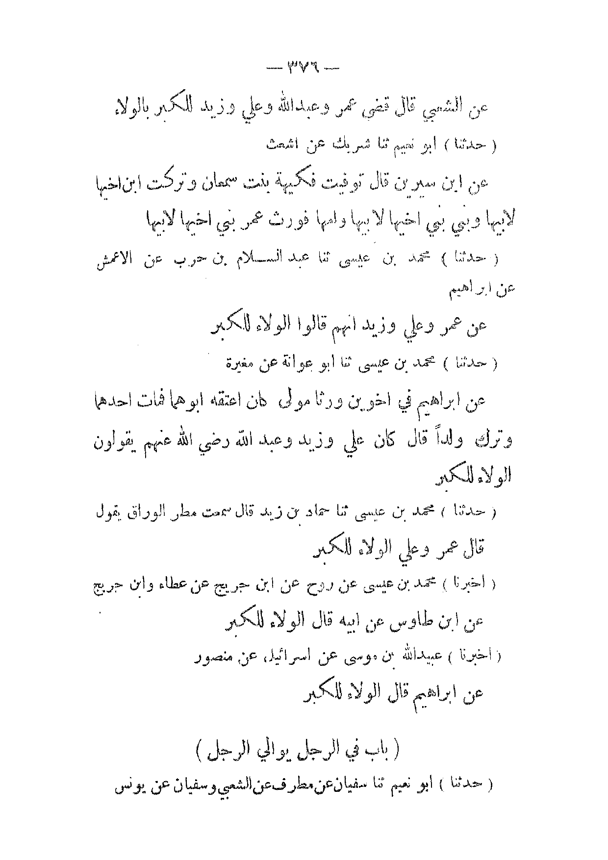 (حدثنا) محمد بن عيسى ثنا حماد بن زيد قال سمعت مطر الوراق يقول قال عمر وعلي الولاء للكبر