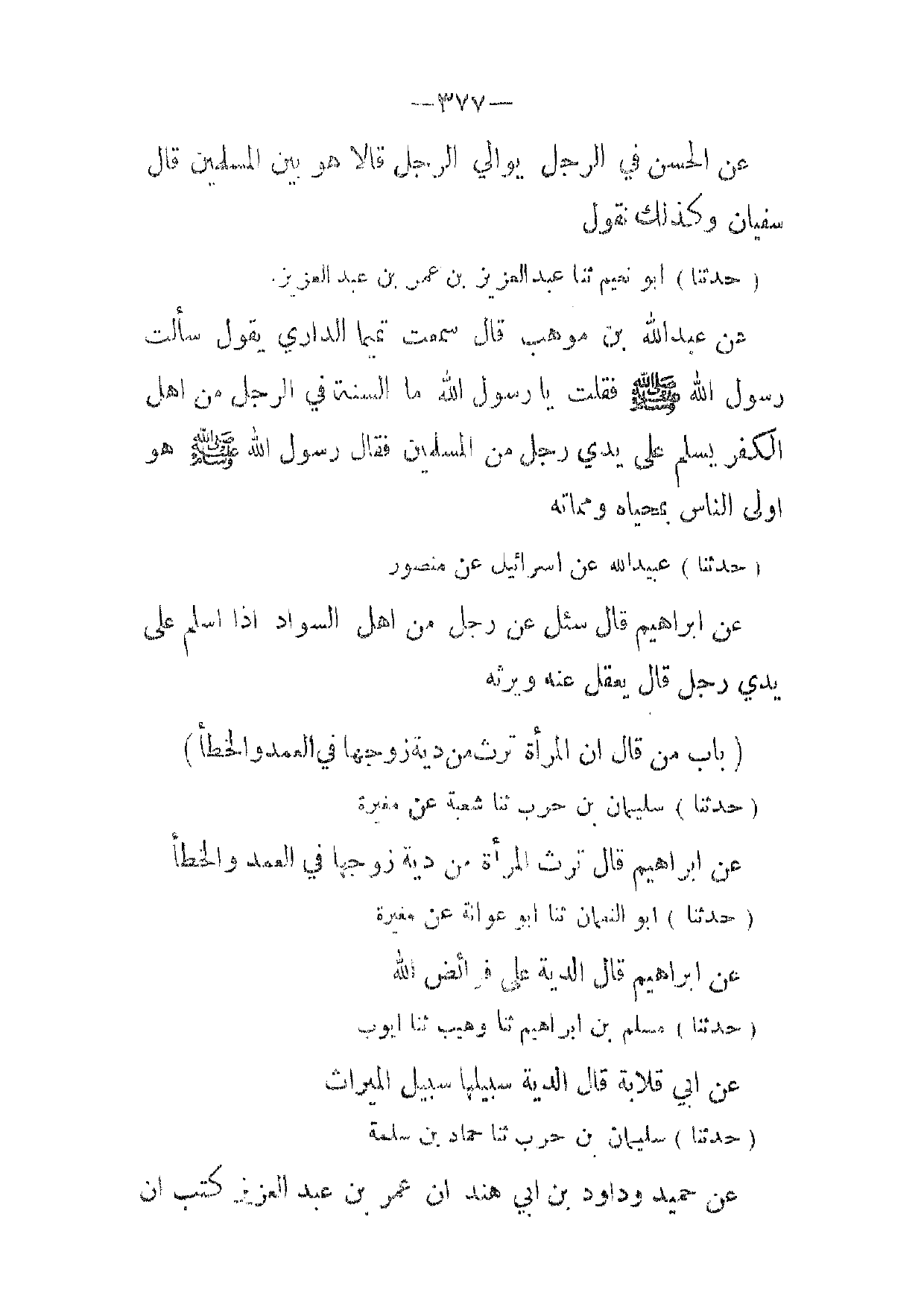 (حدثنا) عبيدالله عن اسرائيل عن منصور عن ابراهيم قال سئل عن رجل من اهل السواد إذا اسلم على يدي رجل قال يعقل عنه ويرثه