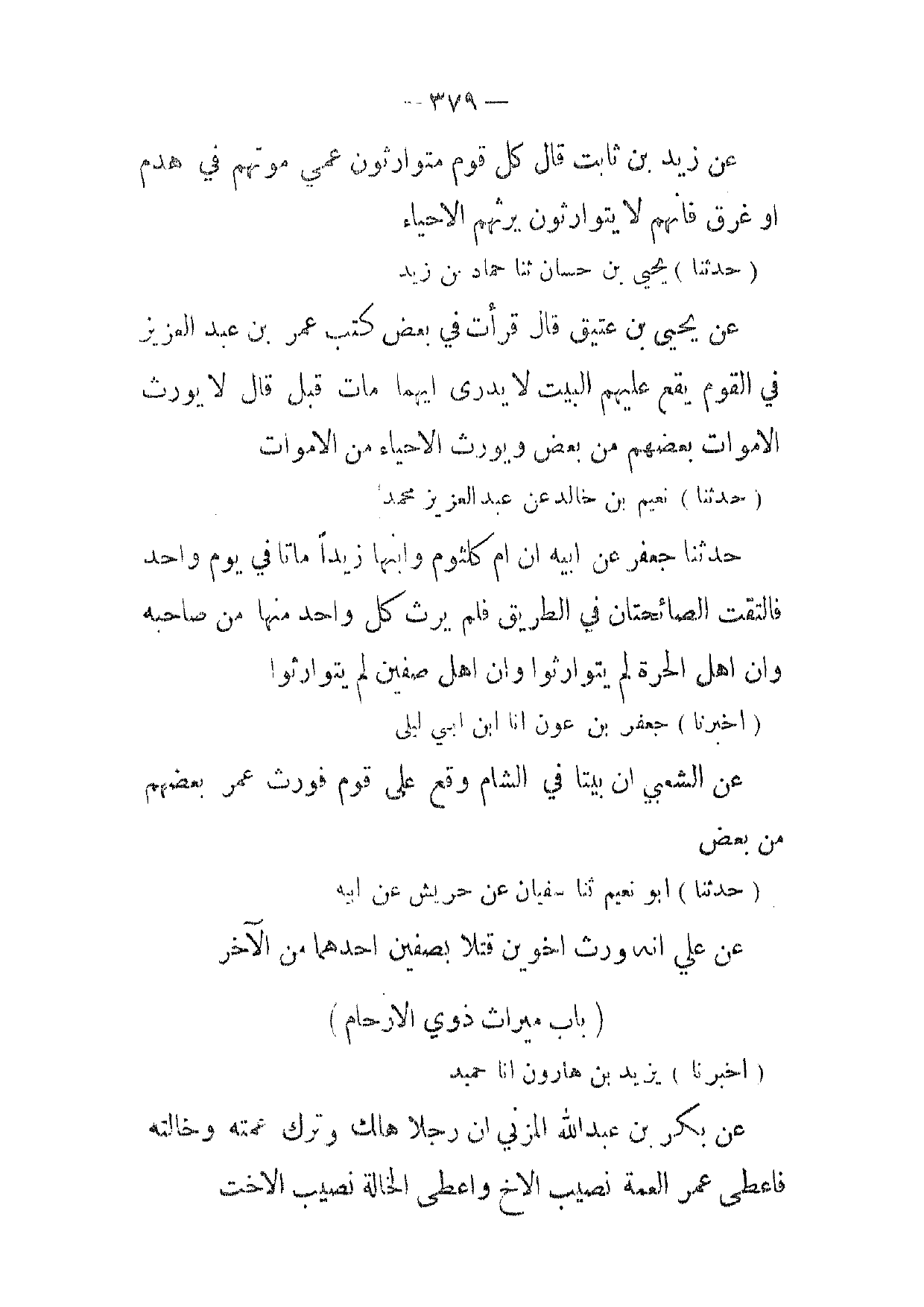 [ 379 ] عن زيد بن ثابت قال كل قوم متوارثون عمي موتهم في هدم أو غرق فانهم لا يتوارثون يرثهم الاحياء