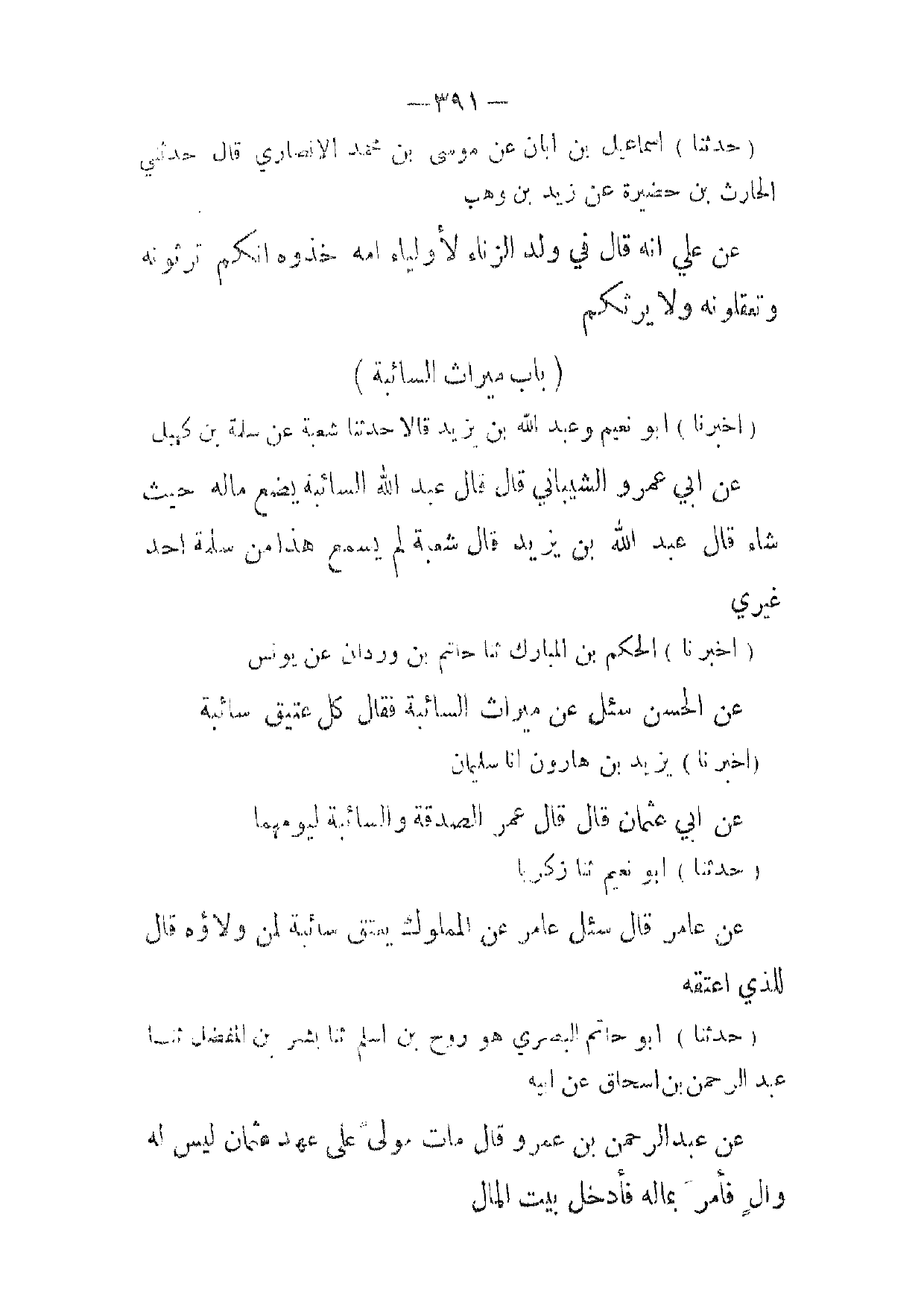 (حدثنا) أبو حاتم البصري هو روح بن اسلم ثنا بشر بن المفضل ثنا عبد الرحمن بن اسحاق عن ابيه عن عبد الرحمن بن عمرو قال مات مولى على عهد عثمان ليس له وال فأمر بماله فأدخل بيت المال