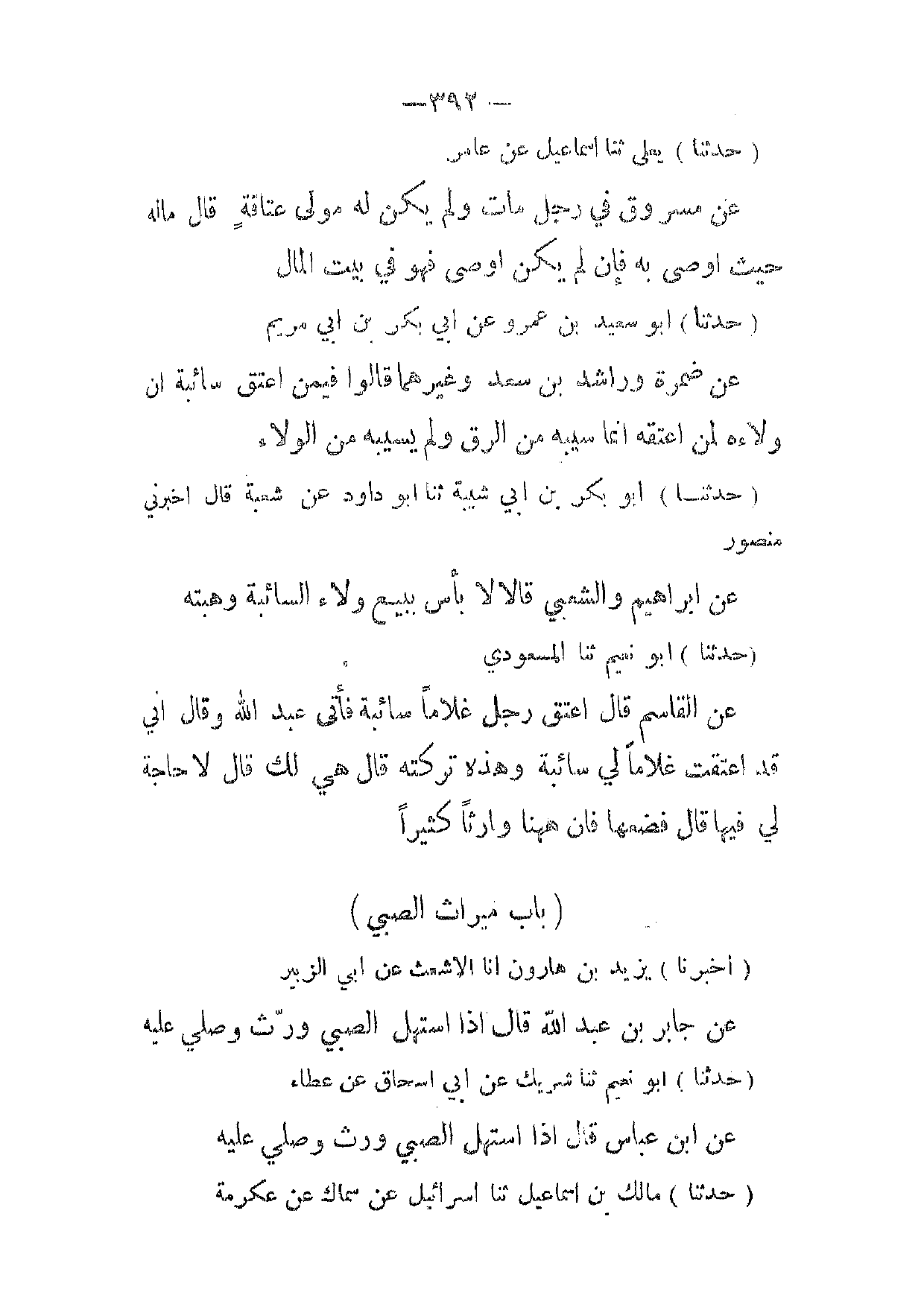 (حدثنا) أبو نعيم ثنا المسعودي عن القاسم قال اعتق رجل غلاما سائبة فأتى عبد الله وقال اني قد اعتقت غلاما لي سائبة وهذه تركته قال هي لك قال لا حاجة لي فيها قال فضعها فان ههنا وارثا كثيرا