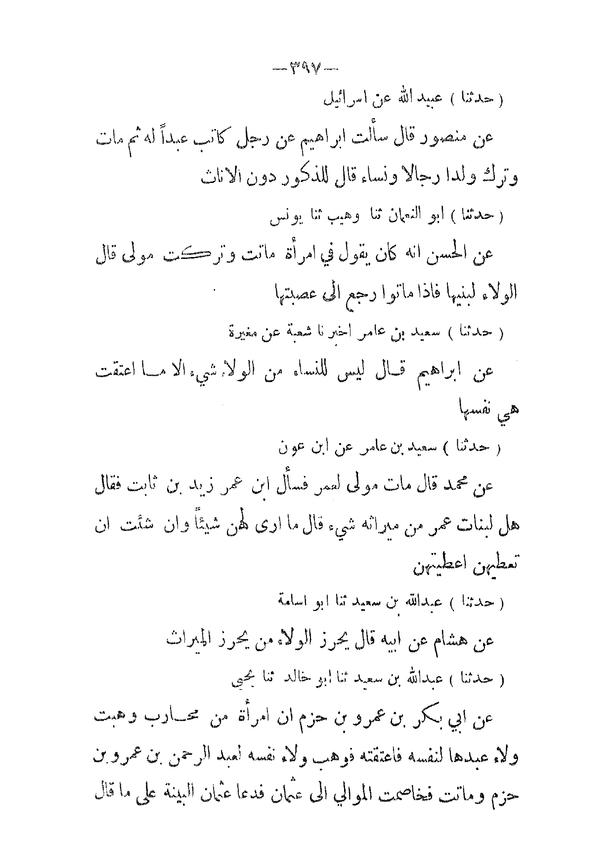 (حدثنا) عبيدالله عن اسرائيل عن منصور قال سألت ابراهيم عن رجل كاتب عبدا له ثم مات وترك ولدا رجالا ونساء قال للذكور دون الاناث