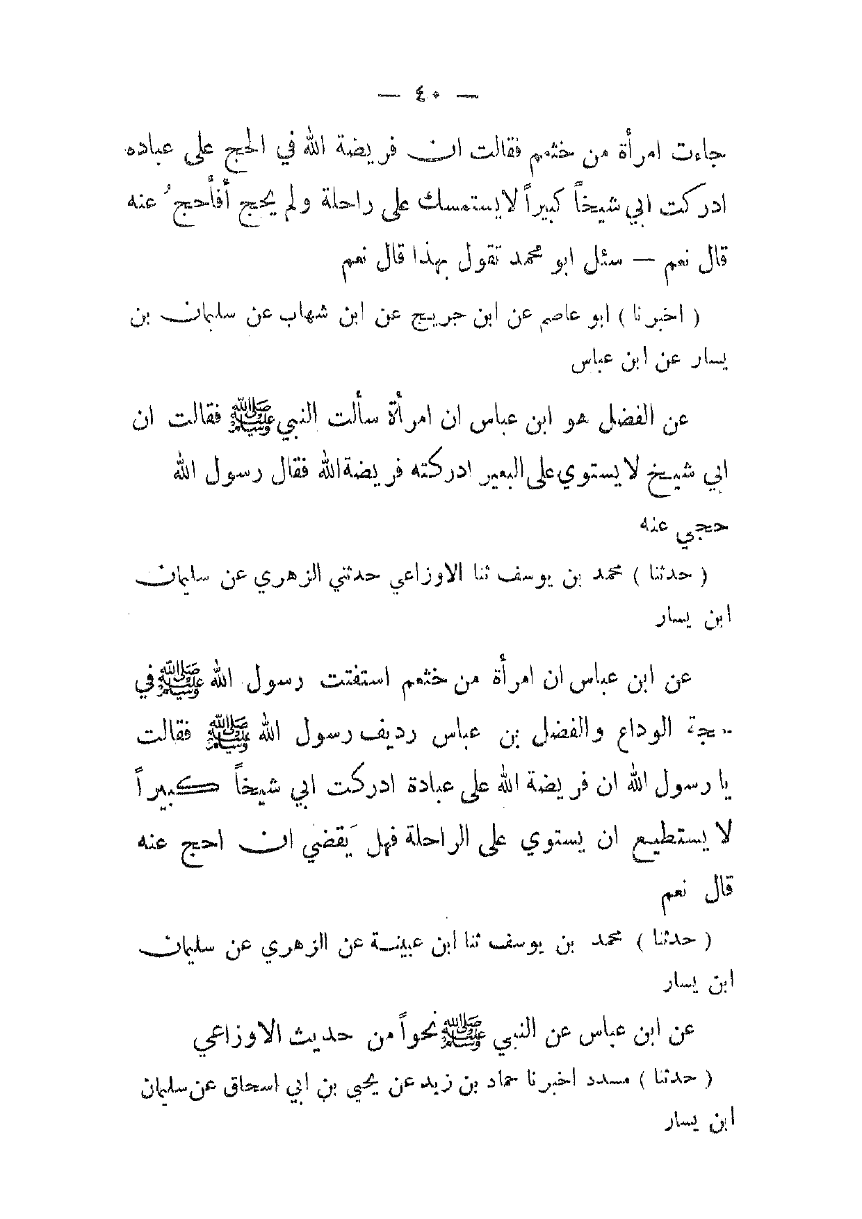 [ 40 ] جاءت امرأة من خثعم فقالت ان فريضة الله في الحج على عباده ادركت ابي شيخا كبيرا لا يستمسك على راحلة ولم يحج أفأحج عنه قال نعم - سئل أبو محمد تقول بهذا قال نعم