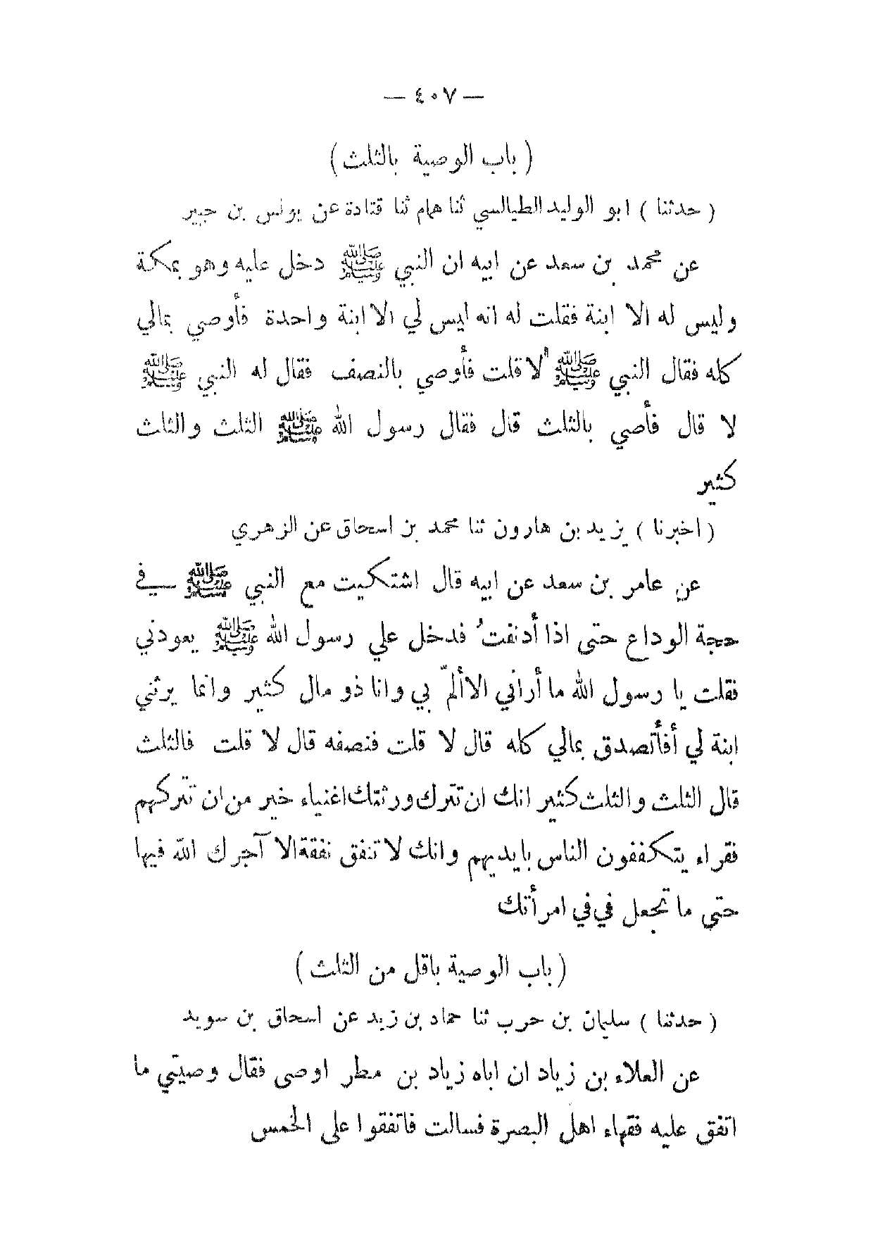 (حدثنا) سليمان بن حرب ثنا حماد بن زيد عن اسحاق بن سويد عن العلاء بن زياد ان اباه زياد بن مطر اوصى فقال وصيتي ما اتفق عليه فقهاء اهل البصرة فسالت فاتفقوا على الخمس