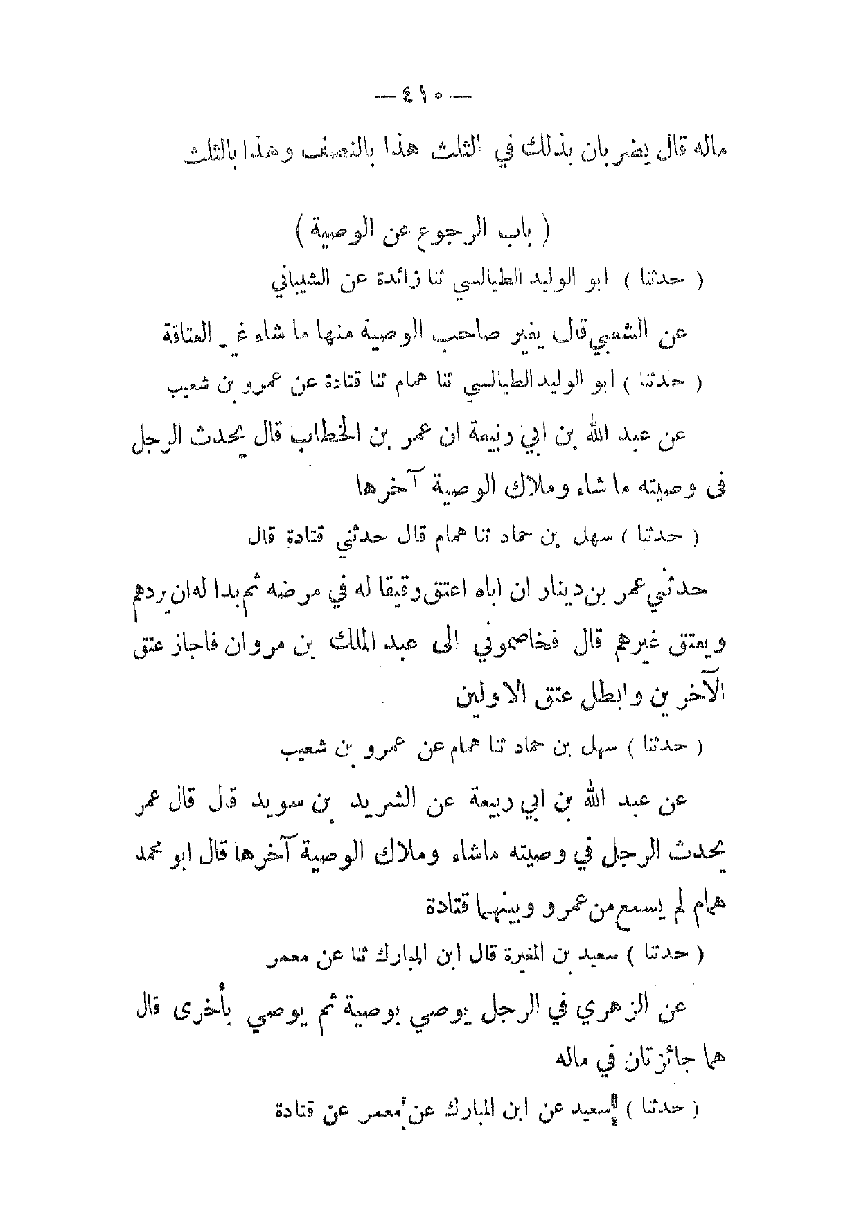 (حدثنا) أبو الوليد الطيالسي ثنا همان ثنا همام ثنا قتادة عن عمرو بن شعيب عن عبد الله بن ابي ربيعة ان عمر بن الخطاب قال يحدث الرجل في وصيته ما شاء وملاك الوصية آخرها
