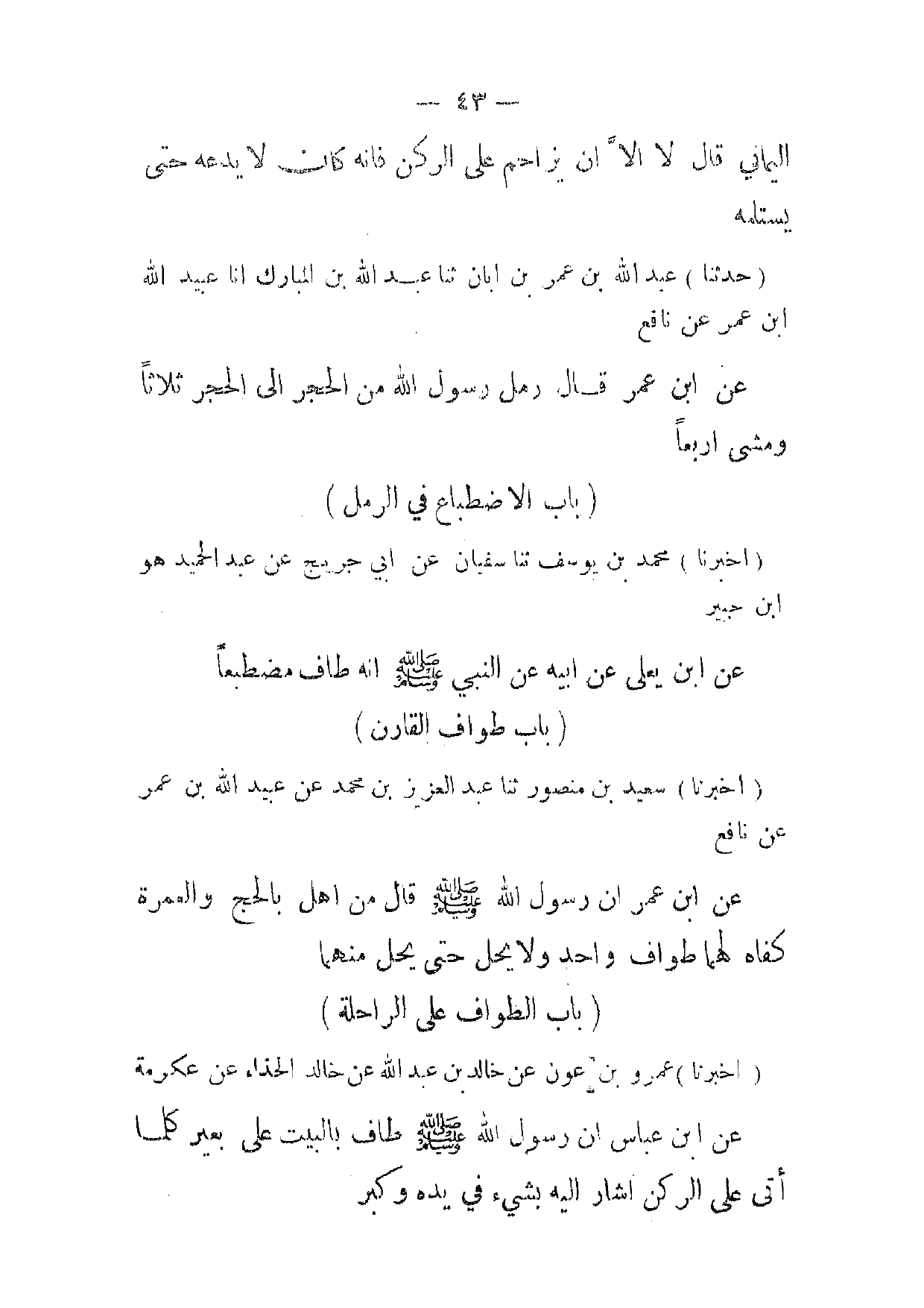 (حدثنا) عبد الله بن عمر بن ابان ثنا عبد الله بن المبارك انا عبيدالله ابن عمر عن نافع عن ابن عمر قال رمل رسول الله من الحجر إلى الحجر ثلاثا ومشى اربعا