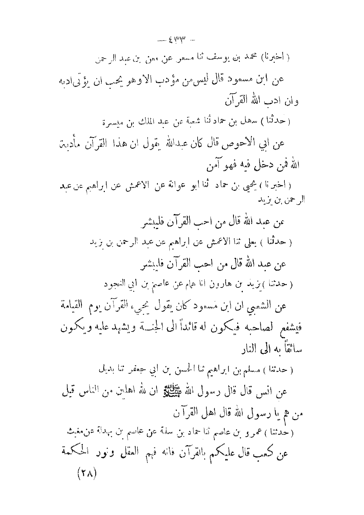 (حدثنا) عمرو بن عاصم ثنا حماد بن سلمة عن عاصم بن بهدلة عن مغيث عن كعب قال عليكم بالقرآن فانه فهم العقل ونور الحكمة (28)