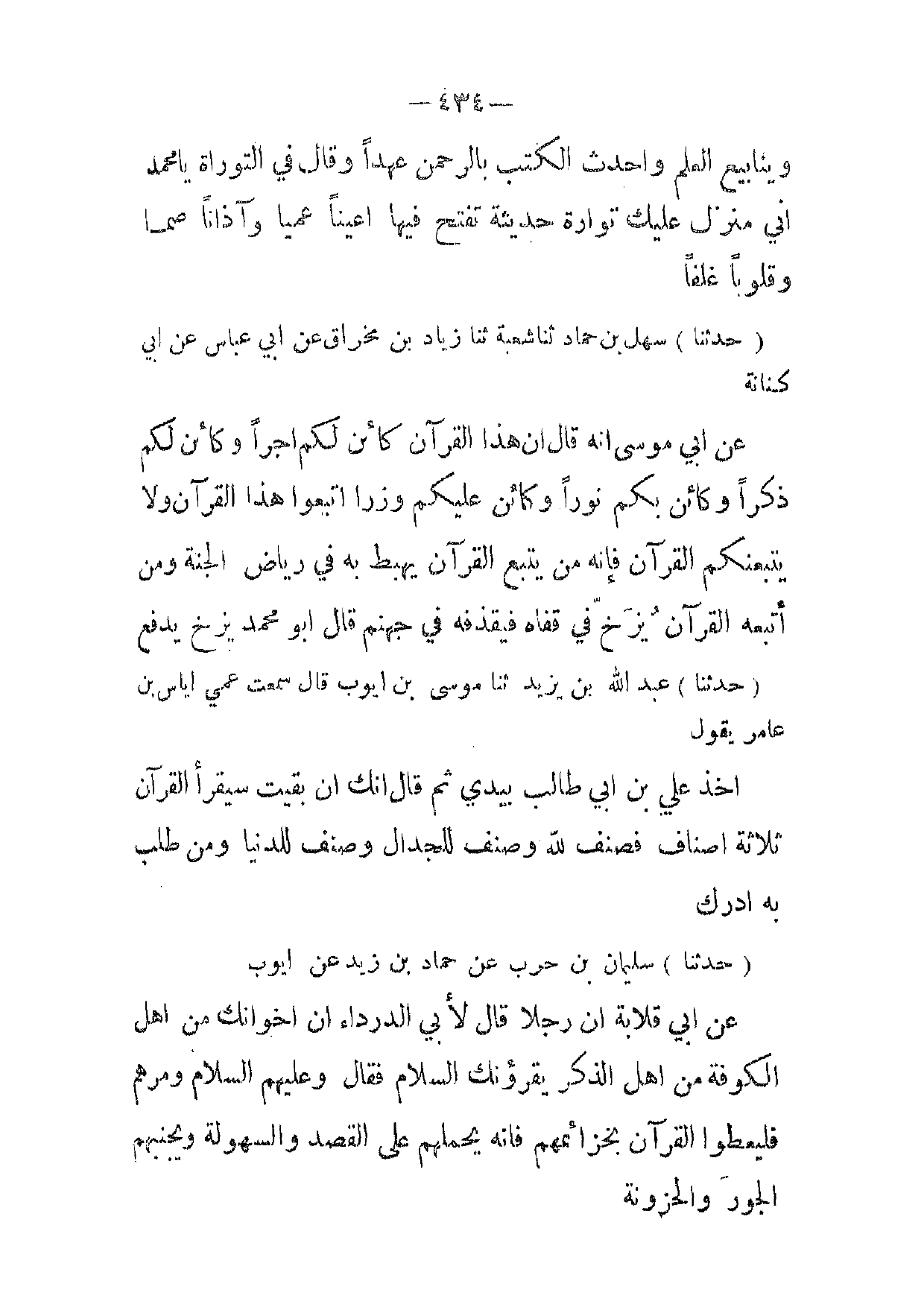 (حدثنا) سهل بن حماد ثنا شعبة ثنا زياد بن مخراق عن ابي عباس عن ابي كنانة عن ابي موسى انه قال ان هذا القرآن كائن لكم اجرا وكائن لكم ذكرا وكائن بكم نورا وكائن عليكم وزرا اتبعوا هذا القرآن ولا يتبعنكم القرآن فإنه من يتبع القرآن يهبط به في رياض الجنة ومن أتبعه القرآن يزخ في قفاه فيقذفه في جهنم قال أبو محمد يزخ يدفع