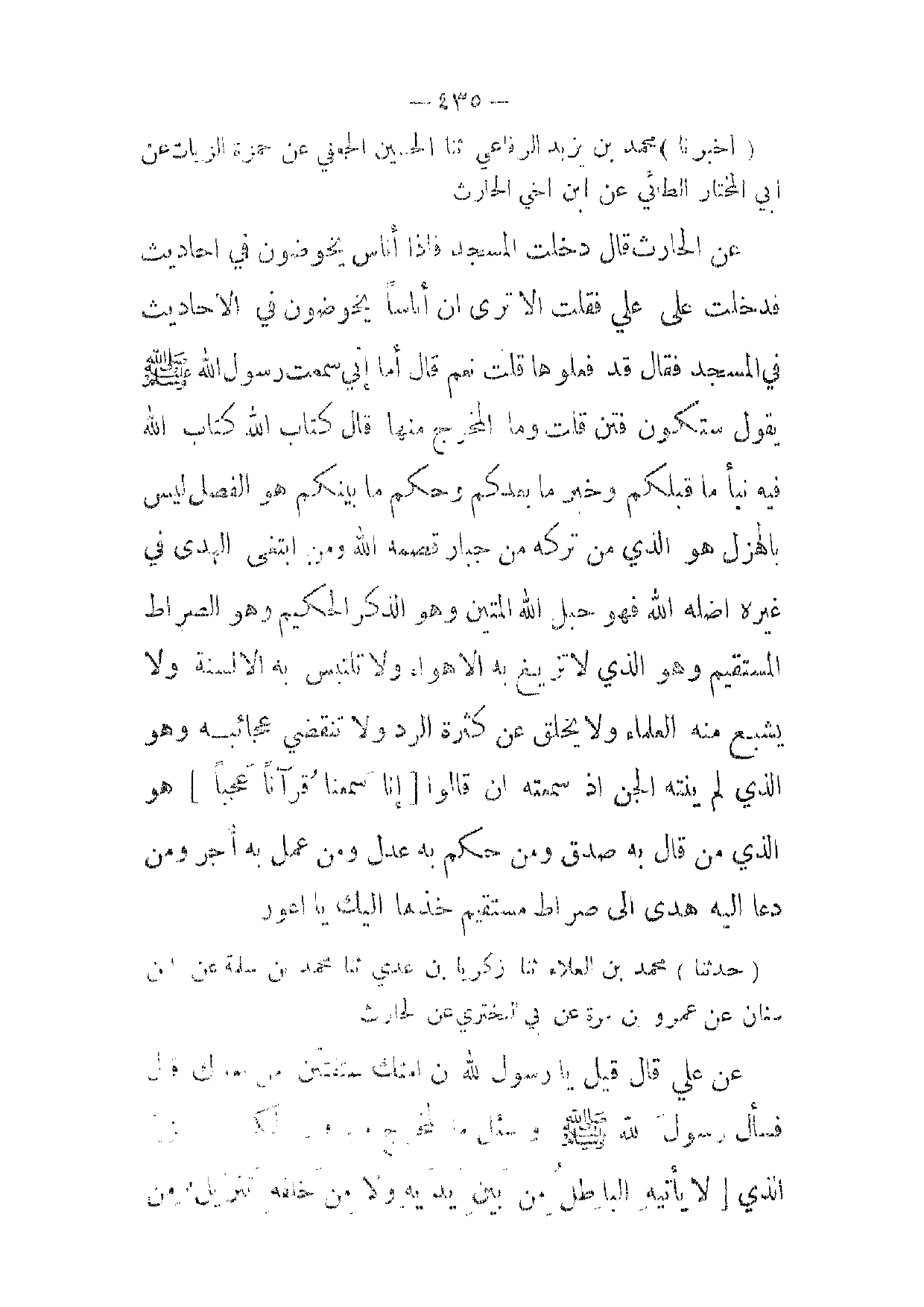 (أخبرنا) محمد بن يزيد الرفاعي ثنا الحسين الجعفي عن حمزة الزيان عن ابي المختار الطائي عن ابن اخي الحارث عن الحارث قال دخلت المسجد فإذا أناس يخوضون في احاديث فدخلت على علي فقلت الا ترى ان أناسا يخوضون في الاحاديث في المسجد فقال قد فعلوها قلت نعم قال أما إني سمعت رسول الله صلى الله عليه وسلم يقول ستكون فتن قلت وما المخرج منها قال كتاب الله كتاب الله فيه نبأ ما قبلكم وخبر ما بعدكم وحكم ما بينكم هم الفصل ليس بالهزل هو الذي من تركه من جبار قصمه الله ومن ابتغى الهدى في غيره اضله الله فهو حبل الله المتين وهو الذكر الحكيم وهو الصراط المستقيم وهو الذي لا تزيغ به الاهواء ولا تلتبس به الا لسنة ولا يشبع منه العلماء ولا يخلق عن كثرة الرد ولا تنقضي عجائبه وهو الذي لم ينته الجن إذ سمعته ان قالوا [إنا سمعنا قرآنا عجبا] هو الذي من قال به صدق ومن حكم به عدل ومن عمل به أجر ومن دعا إليه هدى إلى صراط مستقيم خذها اليك يا اعور