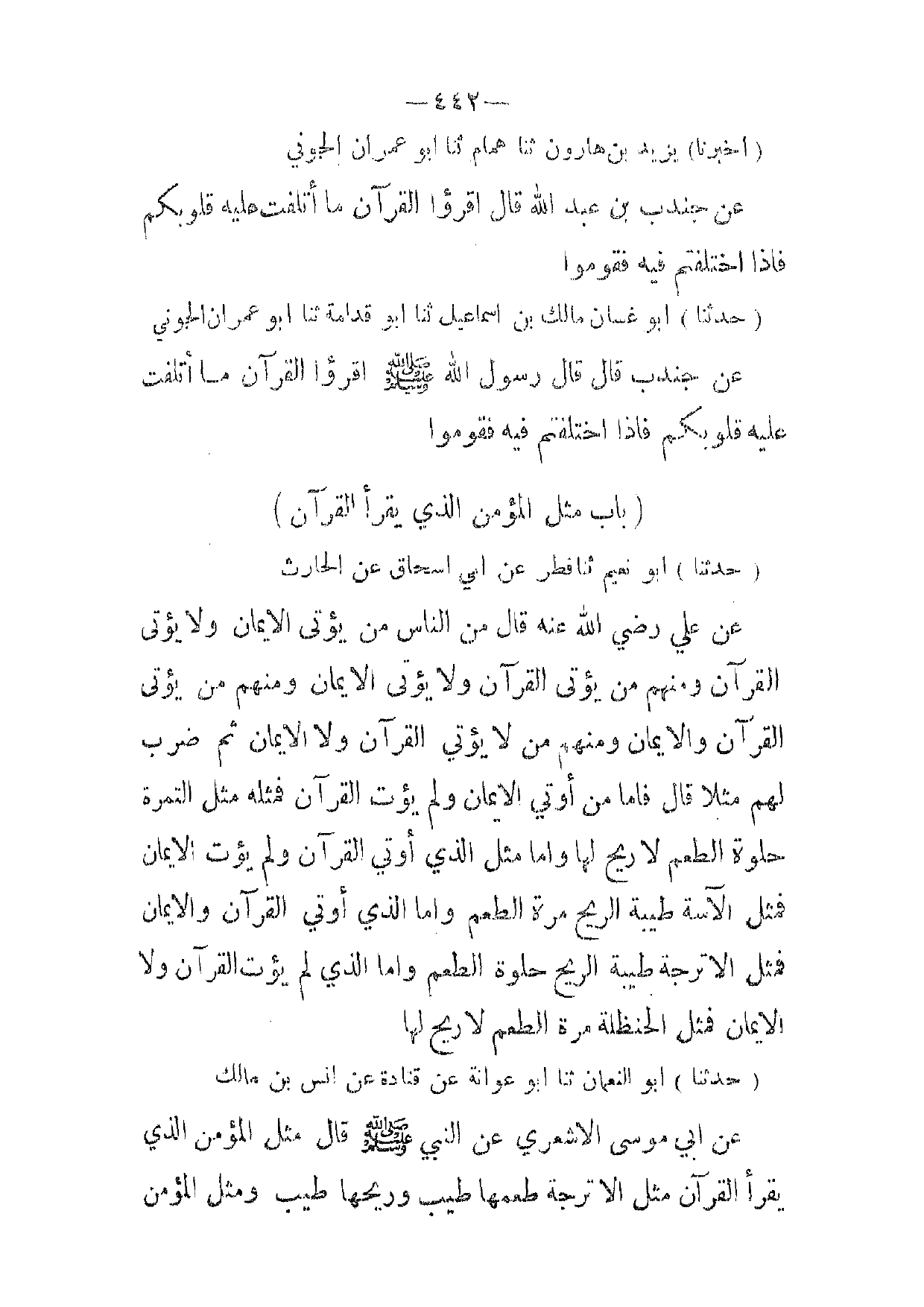 (حدثنا) أبو النعمان ثنا أبو عوانة عن قتادة عن انس بن مالك عن ابي موسى الاشعري عن النبي صلى الله عليه وسلم قال مثل المؤمن الذي يقرأ القرآن مثل الاترجة طعمها طيب وريحها طيب ومثل المؤمن