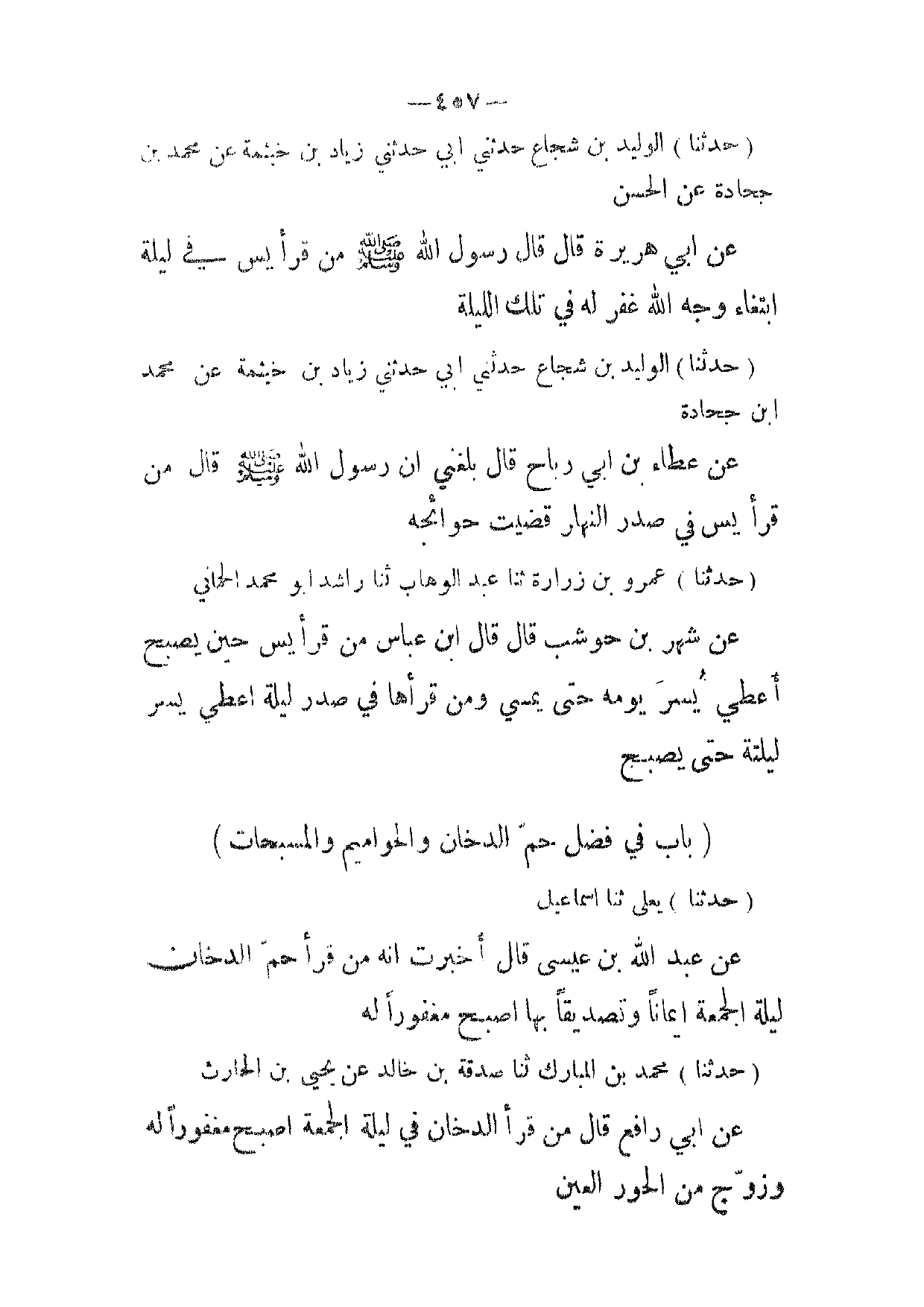 (حدثنا) محمد بن المبارك ثنا صدقة بن خالد عن يحيى بن الحارث عن ابي رافع قال من قرأ الدخان في ليلة الجمعة اصبح مغفورا له وزوج من الحور العين