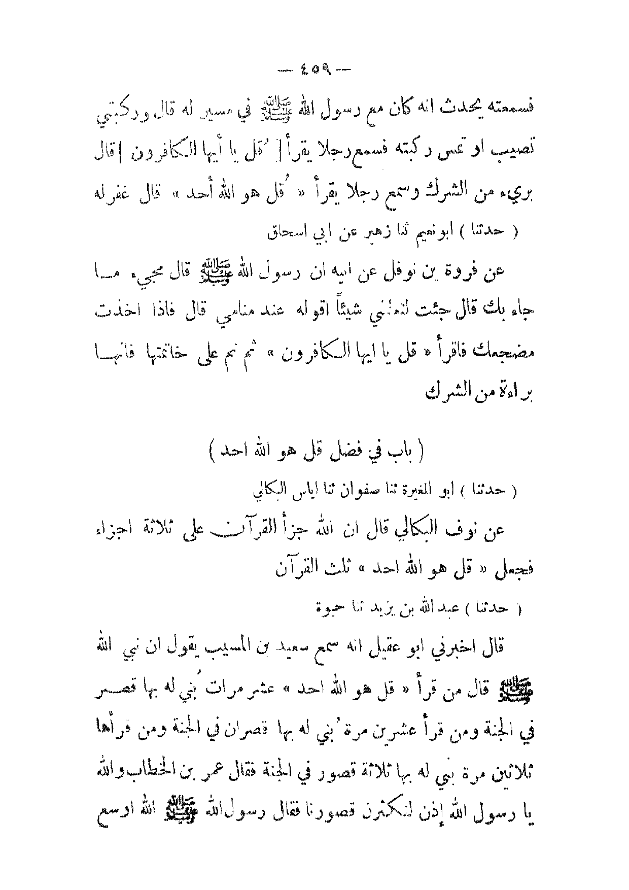 [ 459 ] فسمعته يحدث انه كان مع رسول الله صلى الله عليه وسلم في مسير له قال وركبتي تصيب أو تمس ركبته فسمع رجلا يقرأ [ قل يا أيها الكافرون ] قال برئ من الشرك وسمع رجلا يقرأ " قل هو الله أحد " قال غفر له