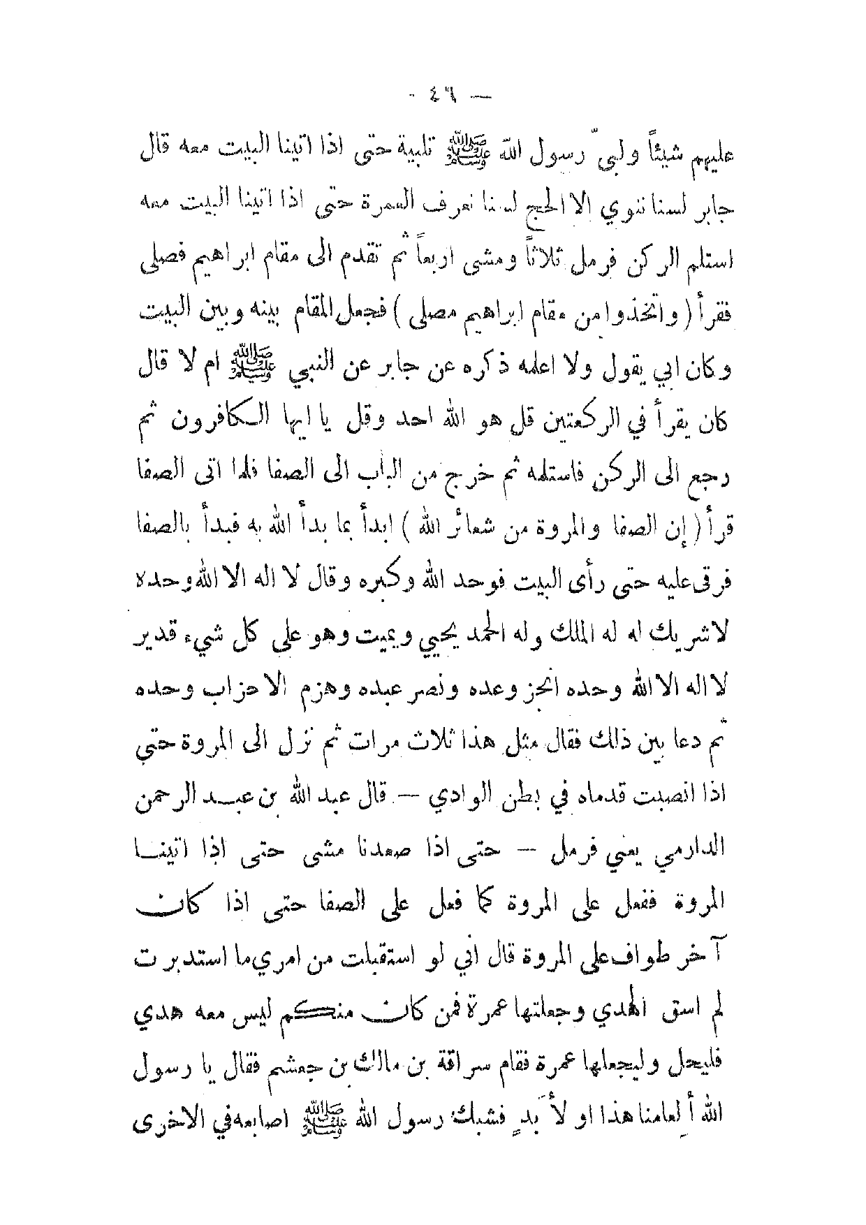 [ 46 ] عليهم شيئا ولبى رسول الله صلى الله عليه وسلم تلبية حتى إذا اتينا البيت معه قال جابر لسناننوي الا الحج لسنا نعرف العمرة حتى إذا اتينا البيت معه استلم الركن فرمل ثلاثا ومشى اربعا ثم تقدم إلى مقام ابراهيم فصلى فقرأ (واتخذوا من مقام ابراهيم مصلى) فجعل المقام بينه وبين البيت وكان ابي يقول ولا اعلمه ذكره عن جابر عن النبي صلى الله عليه وسلم ام لا قال كان يقرأ في الركعتين قل هو الله احد وقل يا ايها الكافرون ثم رجع إلى الركن فاستلمه ثم خرج من الباب إلى الصفا فلما اتى الصفا قرأ (إن الصفا والمروة من شعائر الله) ابدأ بما بدأ الله به فبدأ بالصفا فرقى عليه حتى رأى البيت فوحد الله وكبره وقال لا اله الا الله وحده لا شريك له له الملك وله الحمد يحيي ويميت وهو على كل شئ قدير لا اله الا الله وحده انجز وعده ونصر عبده وهزم الاحزاب وحده ثم دعا بين ذلك فقال مثل هذا ثلاث مرات ثم نزل إلى المروة حتى إذا انصبت قدماه في بطن الوادي - قال عبد الله بن عبد الرحمن الدارمي يعني فرمل - حتى إذا صعدنا مشى حتى إذا اتينا المروة ففعل على المروة كما فعل على الصفا حتى إذا كان آخر طواف على المروة قال اني لو استقبلت من امري ما استدبرت لم اسق الهدي وجعلتها عمرة فمن كان منكم ليس معه هدي فليحل وليجعلها عمرة فقام سراقة بن مالك بن جعشم فقال يا رسول الله ألعامنا هذا أو لابد فشبك رسول الله صلى الله عليه وسلم اصابعه في الاخرى