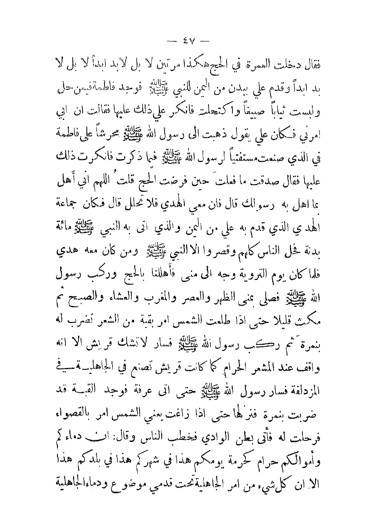 [ 47 ] فقال دخلت العمرة في الحج هكذا مرتين لا بل لابد ابدا لا بل لا بد ابدا وقدم علي ببدن من اليمن للنبي صلى الله عليه وسلم فوجد فاطمة فيمن حل ولبست ثيابا صبيغا واكتحلت فانكر علي ذلك عليها فقالت ان ابي امرني فكان علي يقول ذهبت إلى رسول الله صلى الله عليه وسلم محرشا على فاطمة في الذي صنعت مستفتيا لرسول الله صلى الله عليه وسلم فيما ذكرت فانكرت ذلك عليها فقال صدقت ما فعلت حين فرضت الحج قلت اللهم اني أهل بما اهل به رسولك قال فان معي الهدي فلا تحلل قال فكان جماعة الهدي الذي قدم به علي من اليمن والذي اتى به النبي صلى الله عليه وسلم مائة بدنة فحل الناس كلهم وقصروا الا النبي صلى الله عليه وسلم ومن كان معه هدي فلما كان يوم التروية وجه إلى منى فأهللنا بالحج وركب رسول الله صلى الله عليه وسلم فصلى بمنى الظهر والعصر والمغرب والعشاء والصبح ثم مكث قليلا حتى إذا طلعت الشمس امر بقبة من الشعر تضرب له بنمرة ثم ركب رسول الله صلى الله عليه وسلم فسار لا تشك قريش الا انه واقف عند المشعر الحرام كما كانت قريش تصنع في الجاهلية في المزدلفة فسار رسول الله صلى الله عليه وسلم حتى اتى عرفة فوجد القبة قد ضربت بنمرة فنزلها حتى إذا زاغت يعني الشمس امر بالقصواء فرحلت له فأتى بطن الوادي فخطب الناس وقال : ان دماء كم وأموالكم حرام كحرمة يومكم هذا في شهركم هذا في بلدكم هذا الا ان كل شئ من امر الجاهلية تحت قدمي موضوع ودماء الجاهلية