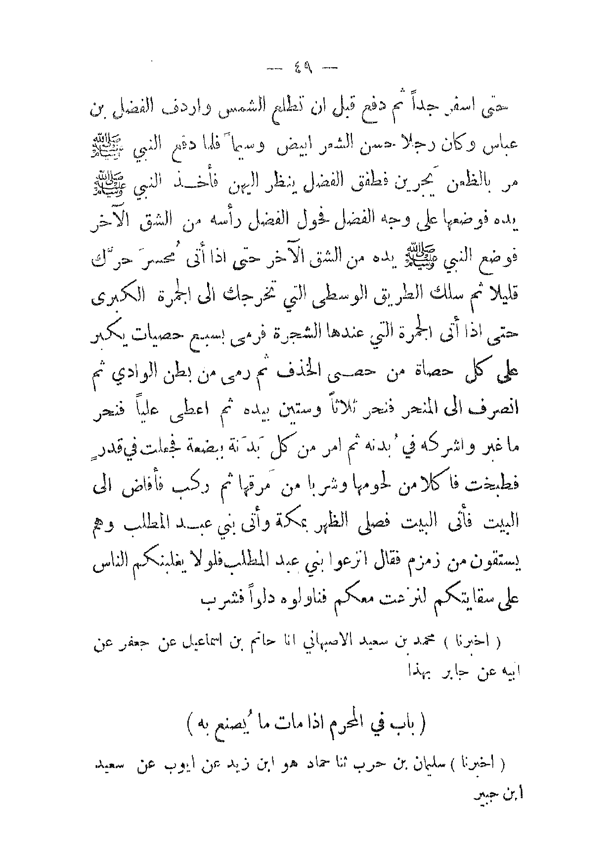 [ 49 ] حتى اسفر جدا ثم دفع قبل ان تطلع الشمس واردف الفضل بن عباس وكان رجلا حسن الشعر ابيض وسيما فلما دفع النبي صلى الله عليه وسلم مر بالظعن يجرين فطفق الفضل ينظر اليهن فأخذ النبي صلى الله عليه وسلم يده فوضعها على وجه الفضل فحول الفضل رأسه من الشق الآخر فوضع النبي صلى الله عليه وسلم يده من الشق الآخر حتى إذا أتى محسر حرك قليلا ثم سلك الطريق الوسطى التي تخرجك إلى الجمرة الكبرى حتى إذا أتى الجمرة التي عندها الشجرة فرمى بسبع حصيات يكبر على كل حصاة من حصى الخذف ثم رمى من بطن الوادي ثم انصرف إلى المنحر فنحر ثلاثا وستين بيده ثم اعطى عليا فنحر ما غبر واشركه في بدنه ثم امر من كل بدنة ببضعة فجعلت في قدر فطبخت فا كلا من لحومها وشربا من مرقها ثم ركب فأفاض إلى البيت فأتى البيت فصلى الظهر بمكة وأتى بني عبد المطلب وهم يستقون من زمزم فقال انزعوا بني عبد المطلب فلولا يغلبنكم الناس على سقايتكم لنزعت معكم فناولوه دلوا فشرب