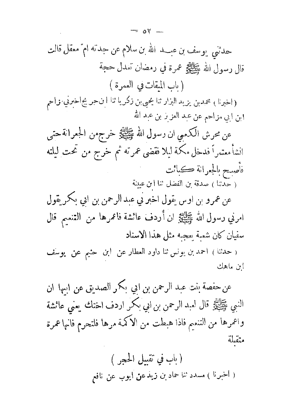 (حدثنا) صدقة بن الفضل ثنا ابن عيينة عن عمرو بن اوس يقول اخبرني عبد الرحمن بن ابي بكر يقول امرني رسول الله صلى الله عليه وسلم ان أردف عائشة فاعمرها من التنعيم قال سفيان كان شعبة يعجبه مثل هذا الاسناد