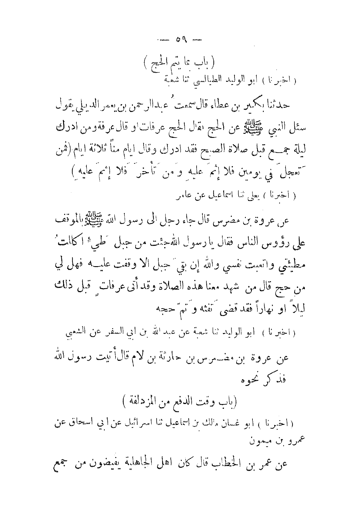 (أخبرنا) أبو الوليد ثنا شعبة عن عبد الله بن ابي السفر عن الشعبي عن عروة بن مضرس بن حارثة بن لام قال أتيت رسول الله فدكر نحوه