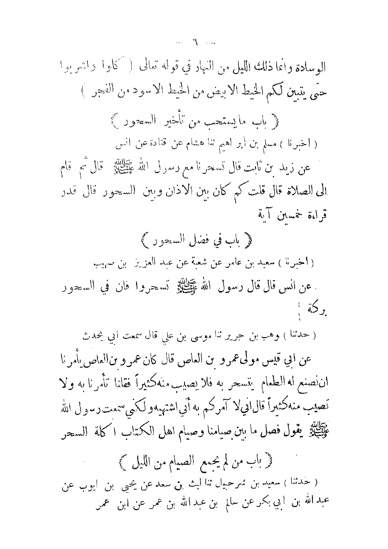 (أخبرنا) مسلم بن ابراهيم ثنا هشام عن قتادة عن أنس عن زيد بن ثابت قال تسحرنا مع رسول الله صلى الله عليه وسلم قال ثم قام إلى الصلاة قال قلت كم كان بين الاذان وبين السحور قال قدر قراءة خمسين آية