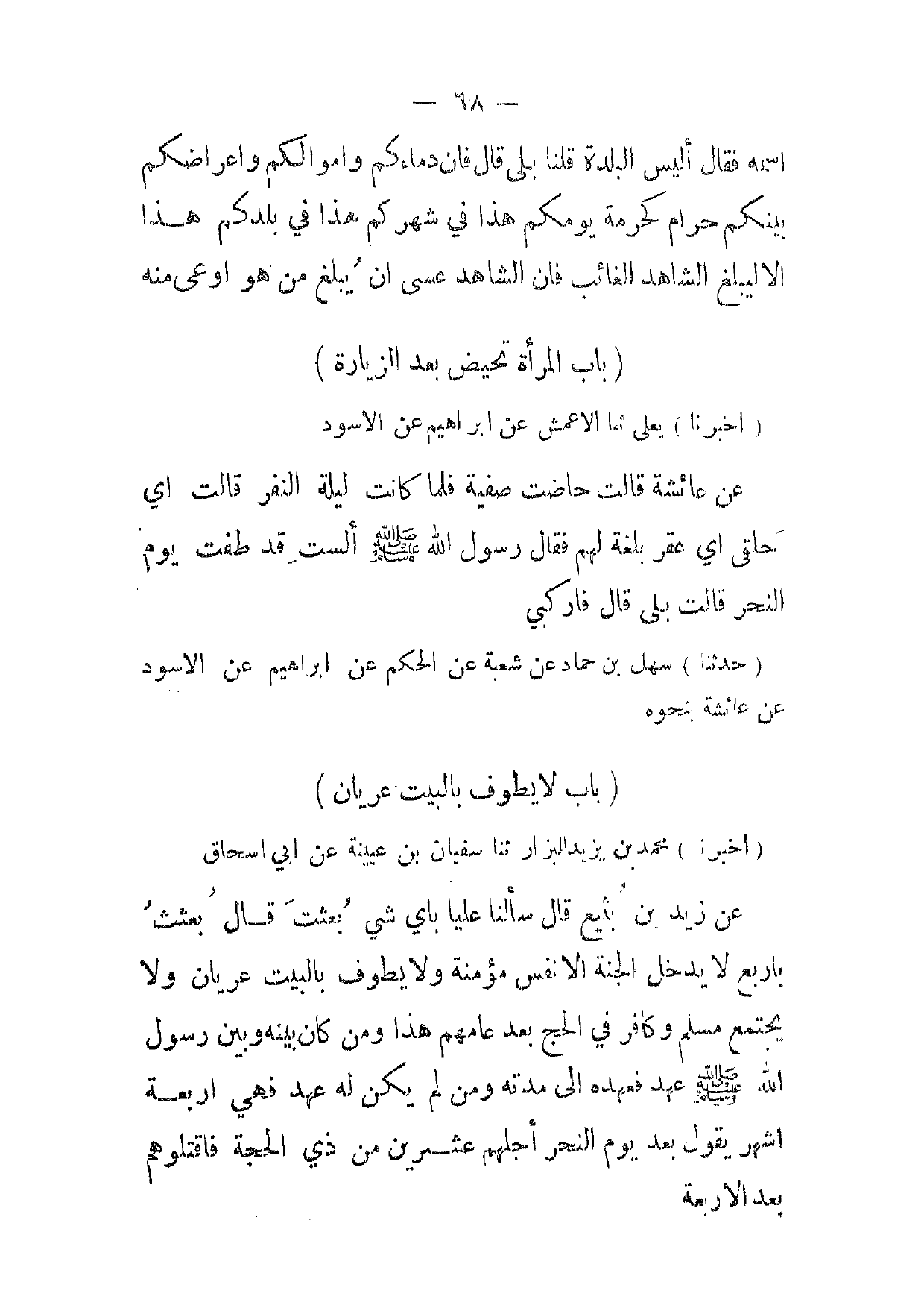 (أخبرنا) يعلى ثنا الاعمش عن ابراهيم عن الاسود عن عائشة قالت حاضت صفية فلما كانت ليلة النفر قالت اي حلقى اي عقر بلغة لهم فقال رسول الله صلى الله عليه وسلم ألست قد طفت يوم النحر قالت بلى قال فاركبي