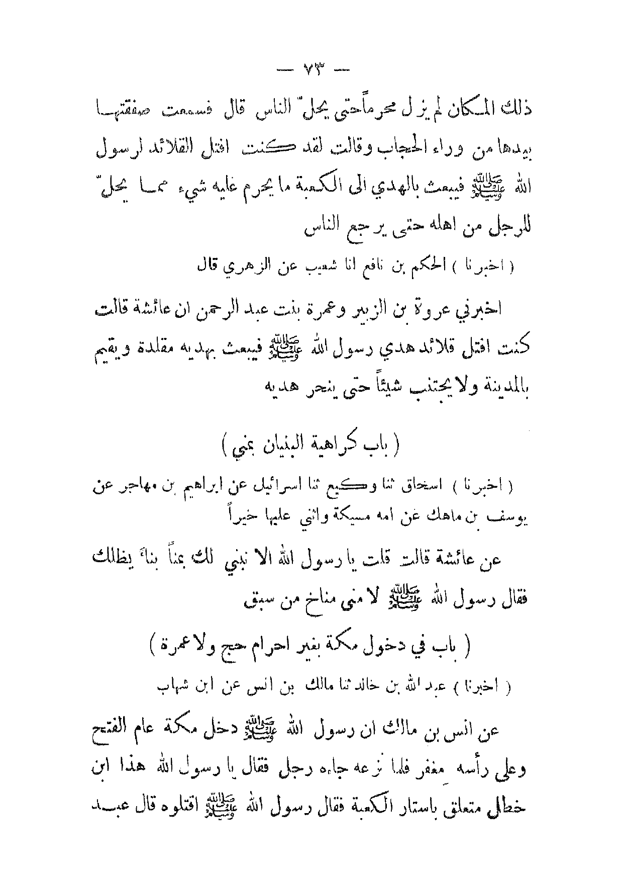 [ 73 ] ذلك المكان لم يزل محرما حتى يحل الناس قال فسمعت صفقتها بيدها من وراء الحجاب وقالت لقد كنت افتل القلائد لرسول الله صلى الله عليه وسلم فيبعث بالهدي إلى الكعبة ما يحرم عليه شئ مما يحل للرجل من اهله حتى يرجع الناس