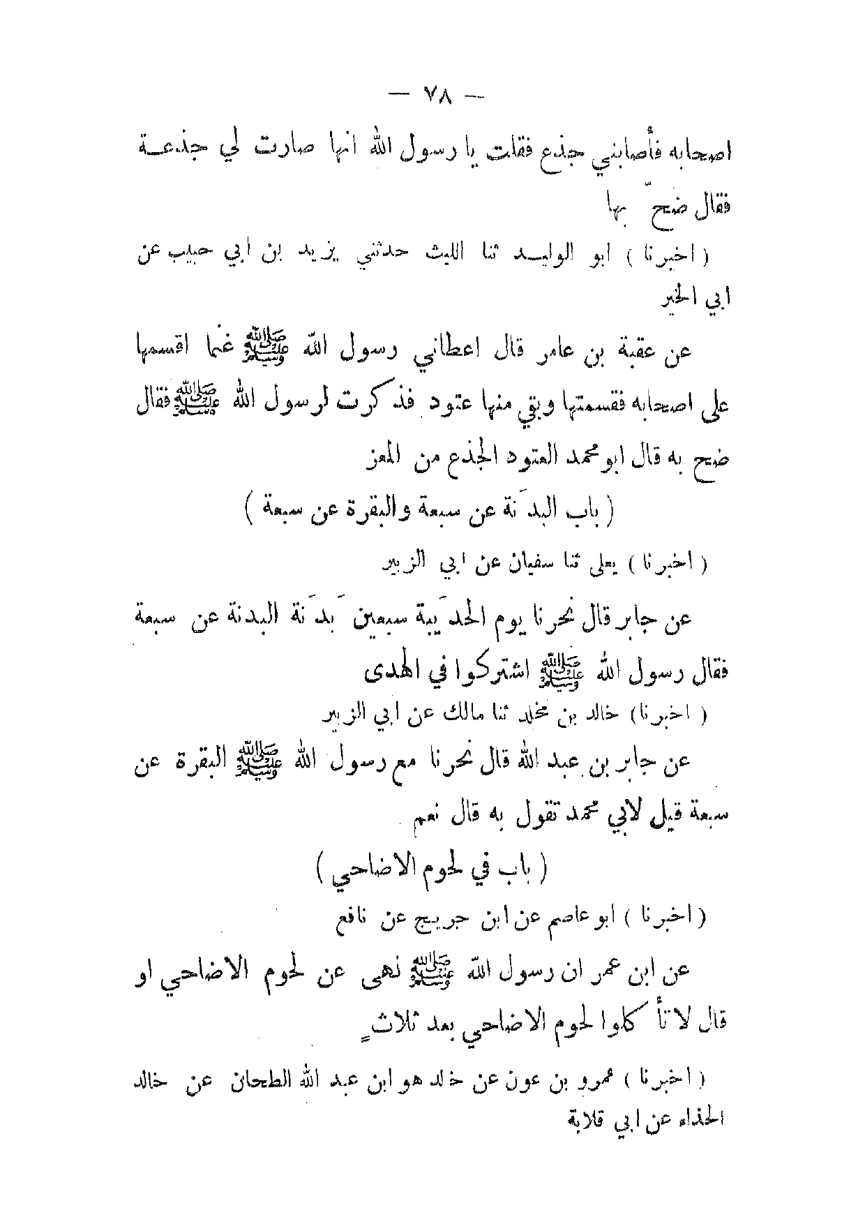 [ 78 ] اصحابه فأصابني جذع فقلت يا رسول الله انها صارت لي جذعة فقال ضح بها