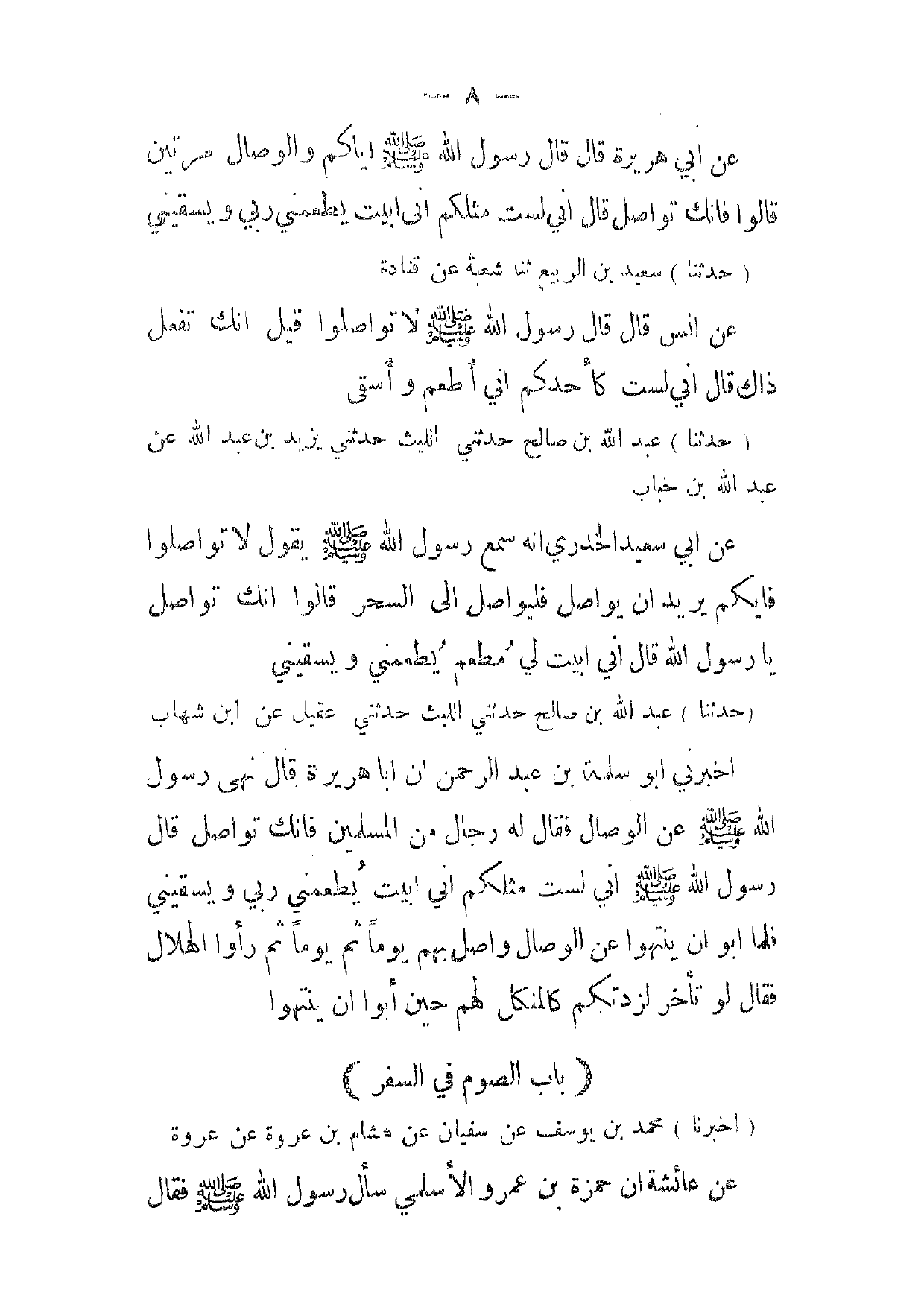 (حدثنا) عبد الله بن صالح حدثني الليث حدثني يزيد بن عبد الله عن عبد الله بن خباب عن ابي سعيد الخدري انه سمع رسول الله صلى الله عليه وسلم يقول لا تواصلوا فايكم يريدان يواصل فليواصل إلى السحر قالوا انك تواصل يا رسول الله قال اني ابيت لي مطعم يطعمني ويسقيني