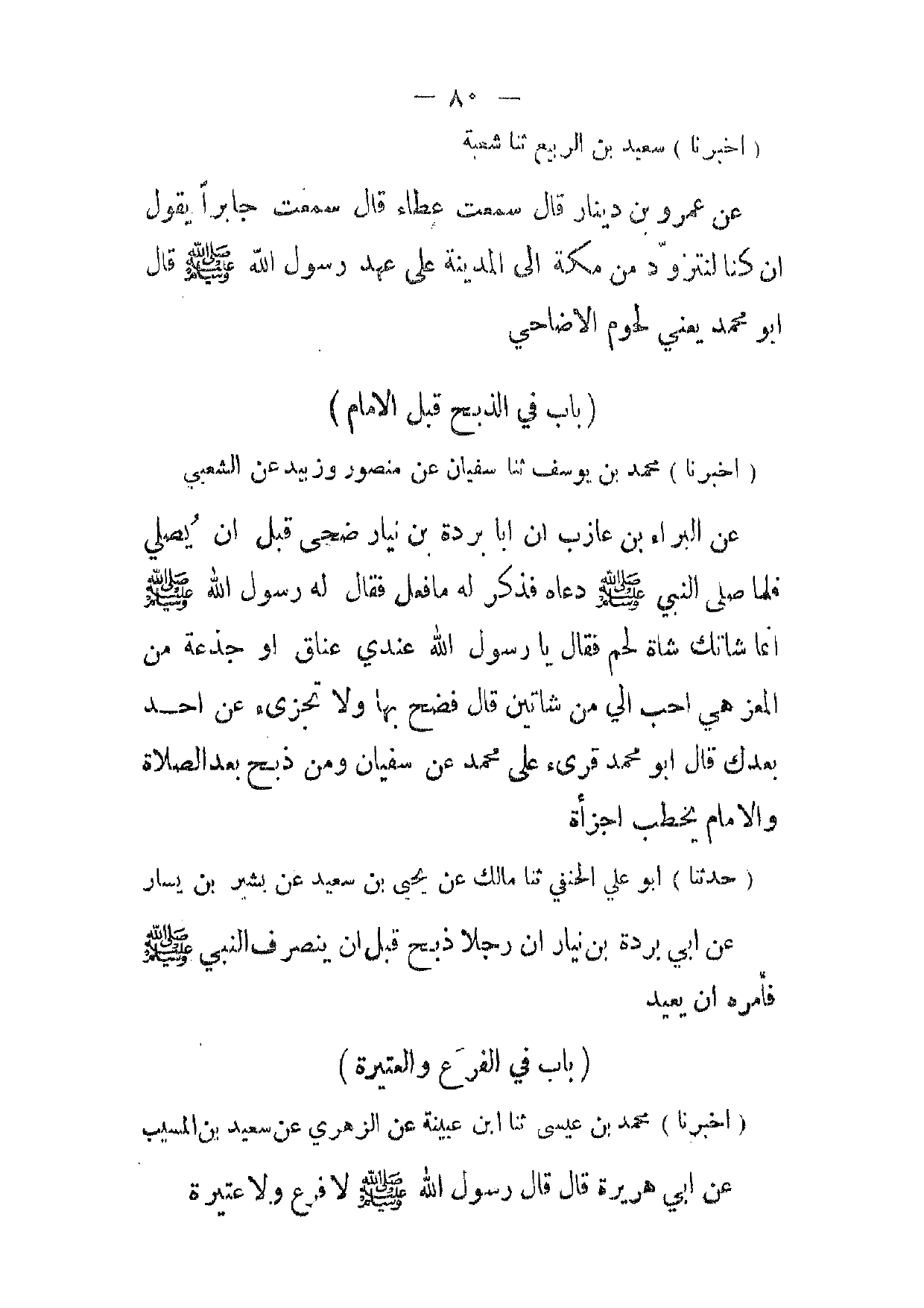 (أخبرنا) محمد بن عيسى ثنا ابن عيينة عن الزهري عن سعيد بن المسيب عن ابي هريرة قال قال رسول الله صلى الله عليه وسلم لا فرع ولا عتيرة