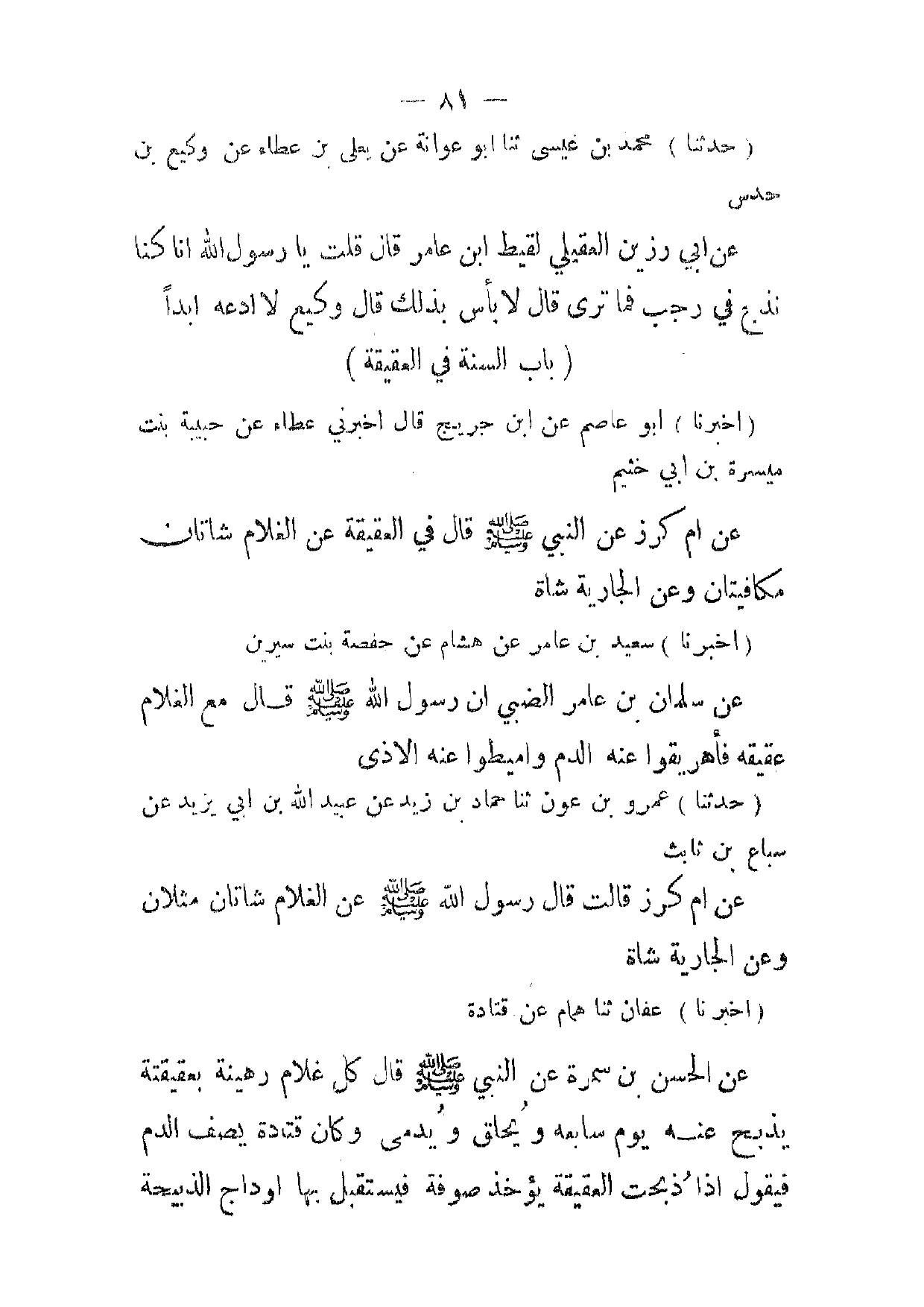 (حدثنا) محمد بن عيسى ثنا أبو عوانة عن يعلى بن عطاء عن وكيع بن حدس عن ابي رزين العقيلي لقيط ابن عامر قال قلت يا رسول الله انا كنا نذج في رجب فما ترى قال لا بأس بذلك قال وكيع لا ادعه ابدا
