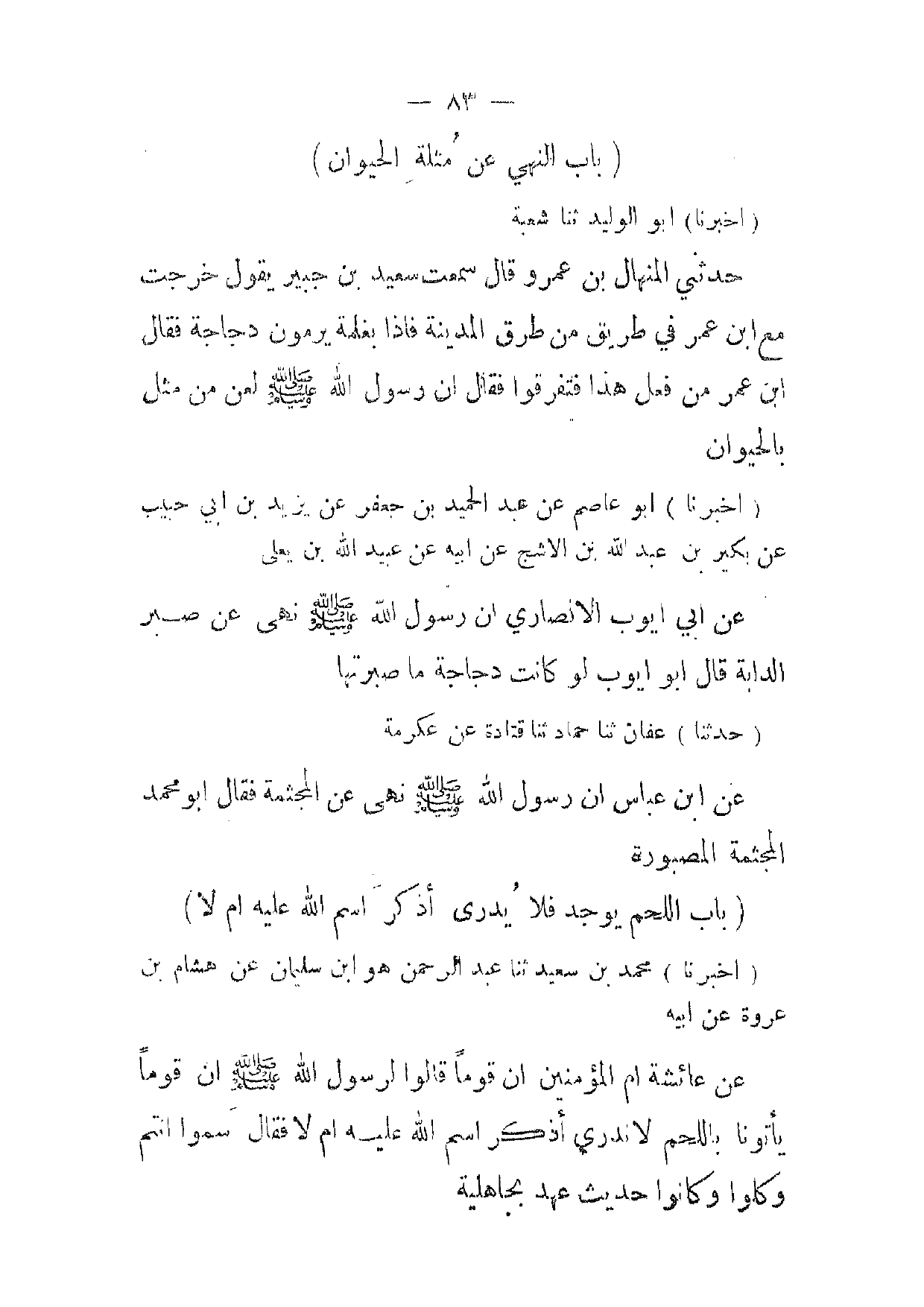 (أخبرنا) أبو الوليد ثنا شعبة حدثني المنهال بن عمرو قال سمعت سعيد بن جبير يقول خرجت مع ابن عمر في طريق من طرق المدينة فإذا بغلمة يرمون دجاجة فقال ابن عمر من فعل هذا فتفرقوا فقال ان رسول الله صلى الله عليه وسلم لعن من مثل بالحيوان