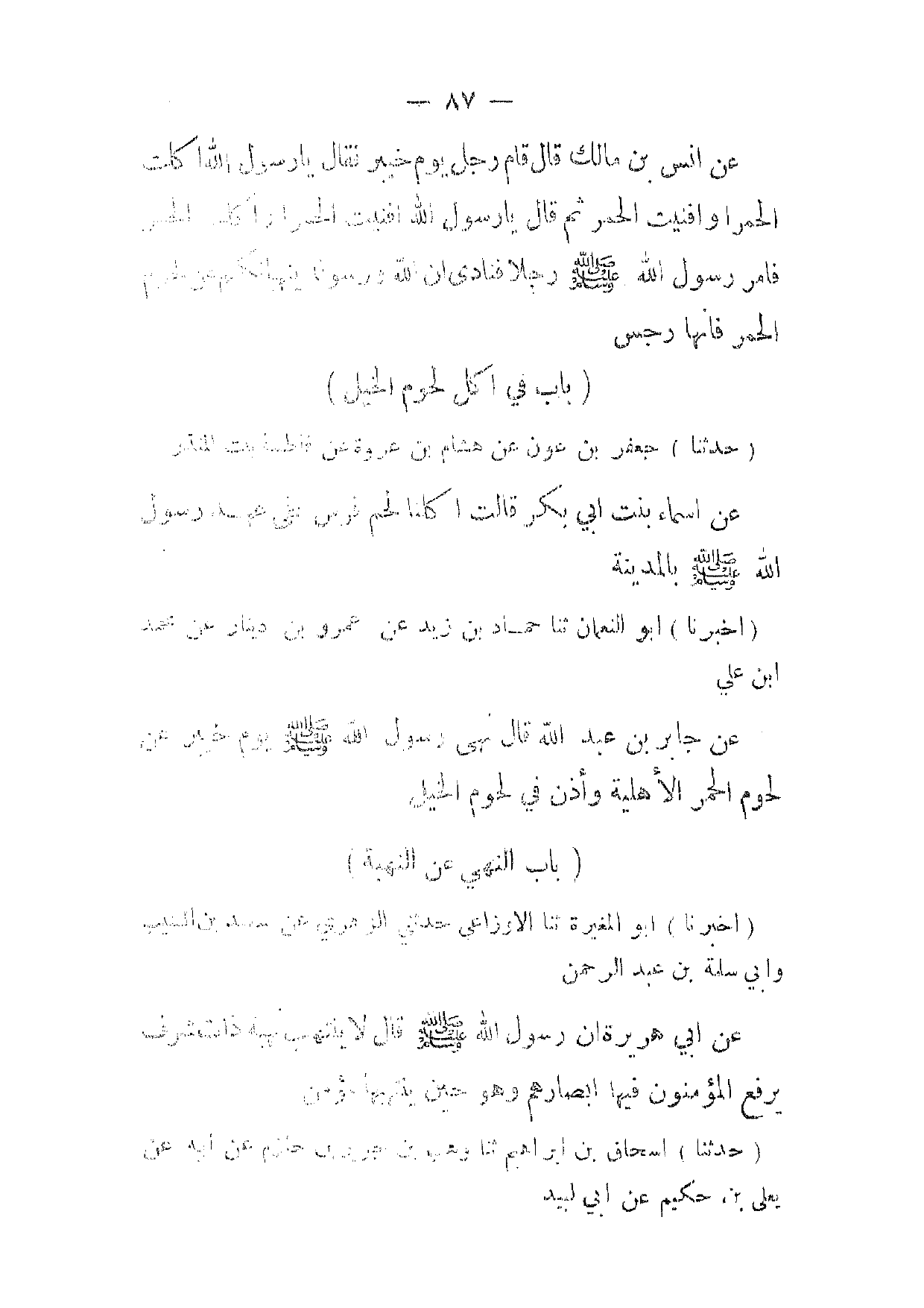 [ 87 ] عن انس بن مالك قال قام رجل يوم خيبر فقال يا رسول الله اكلت الحمرا وافنيت الحمر ثم قال يا رسول الله افنيت الحمرا واكلت الحمر فامر رسول الله صلى الله عليه وسلم رجلا فنادى ان الله ورسوله ينهيانكم عن لحوم الحمر فانها رجس