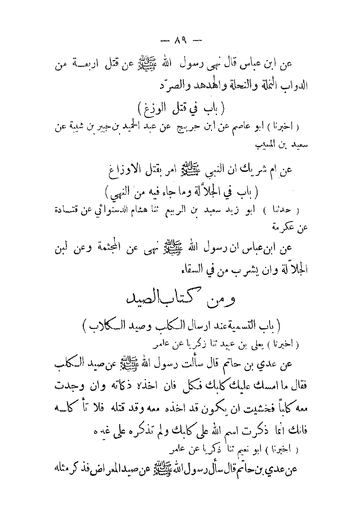 [89] عن ابن عباس قال نهى رسول الله صلى الله عليه وسلم عن قتل اربعة من الدواب النملة والنحلة والهدهد والصرد